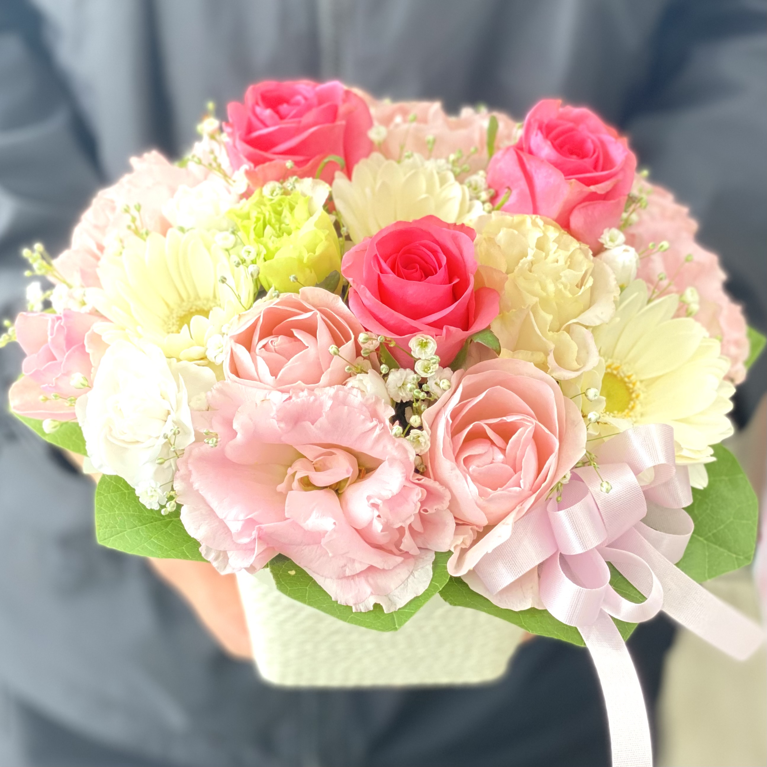 淡い優しい雰囲気のアレンジメント。ピンクと白のコントラストが優しい気持ちにさせてくれるアレンジです。【15時迄のご注文で翌日届きます】※こちらの商品についてのご相談、ご質問等ございましたら(メール)または(お電話)にて承ります。