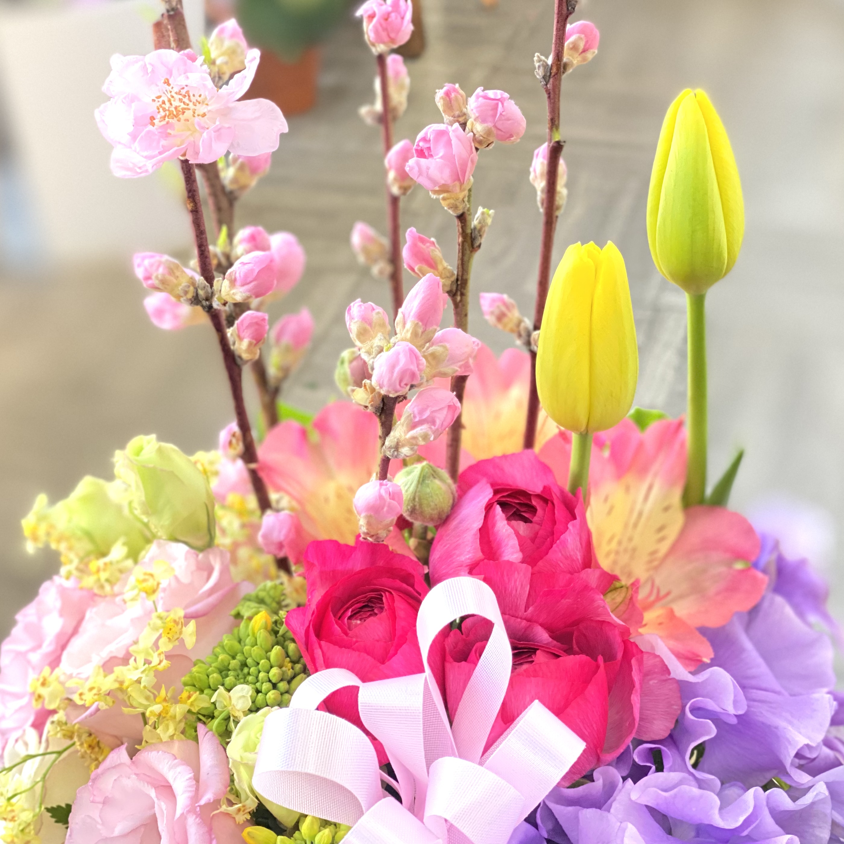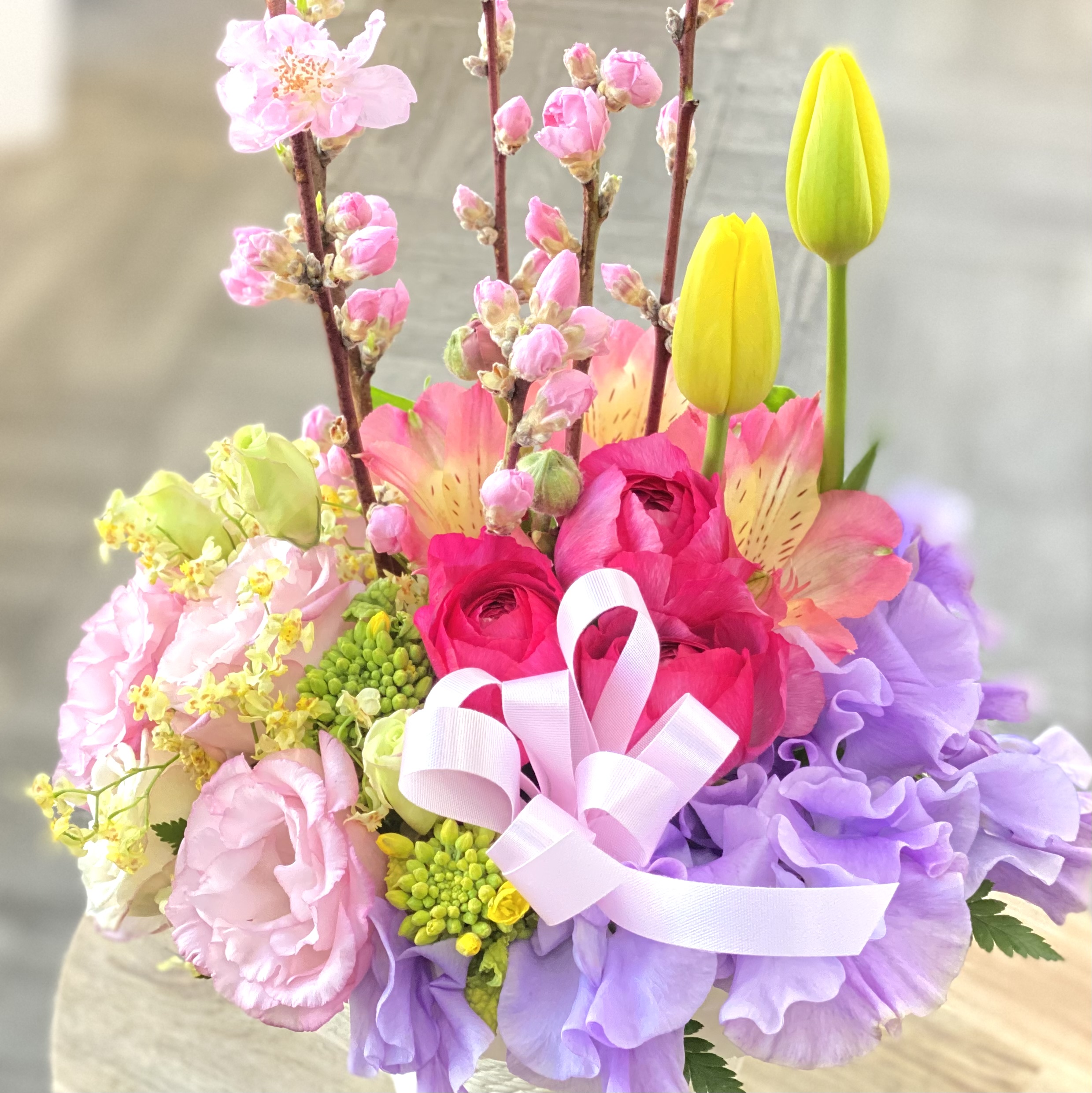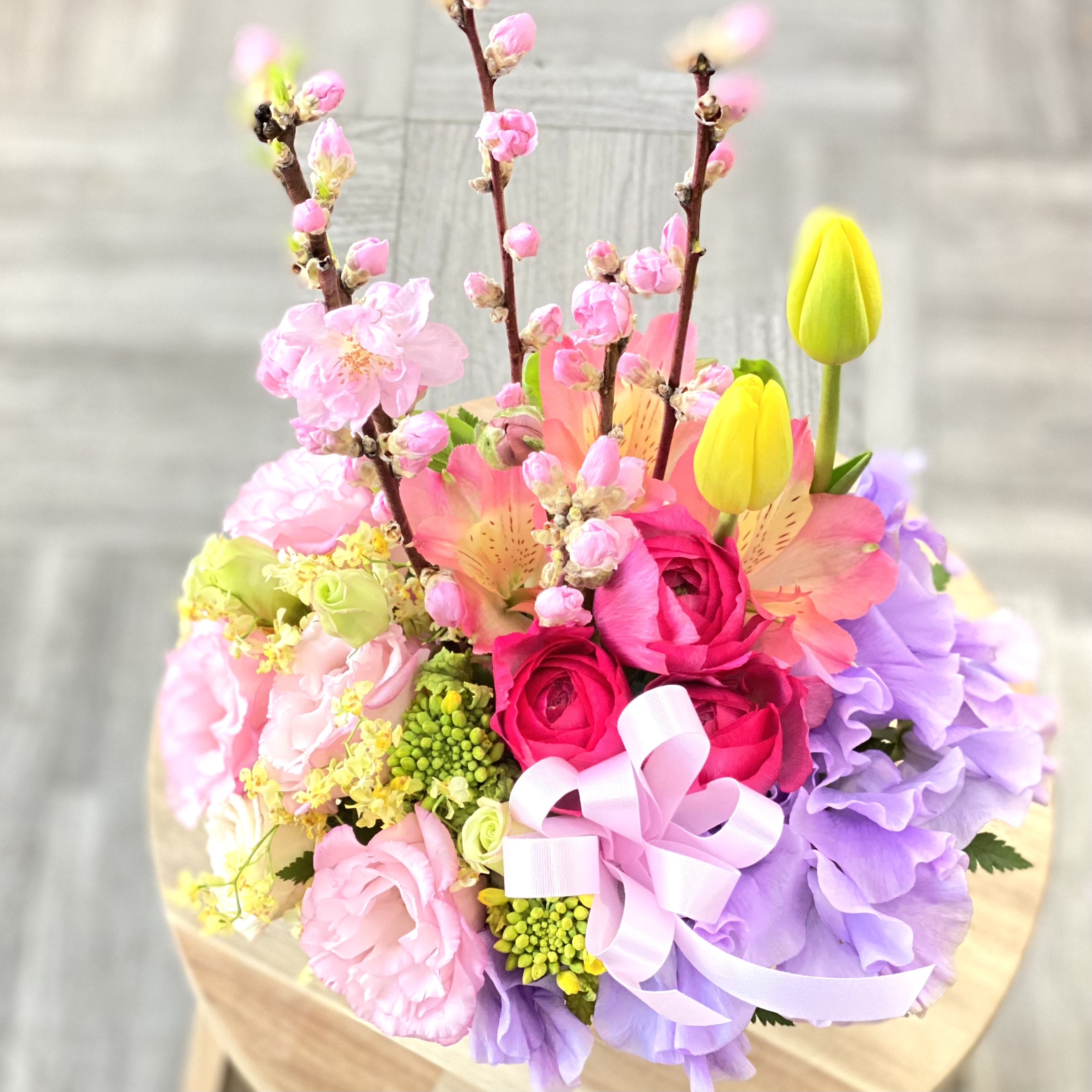 桃の花の入った春の訪れを感じるアレンジメントです。桃の花やこの季節にぴったりなチューリップ、スイートピーなどの明るい色合いのお花とあわせて上品に制作しました。もちろん厳選した花材を使用しておりますので、ご利用されたお客様から「大変花持ちが良い」と好評ですよ。あなたの大切な人へ…心を込めてこのアレンジを贈ってみてはいかがですか。さまざまなご用途にお使いいただけますよ。