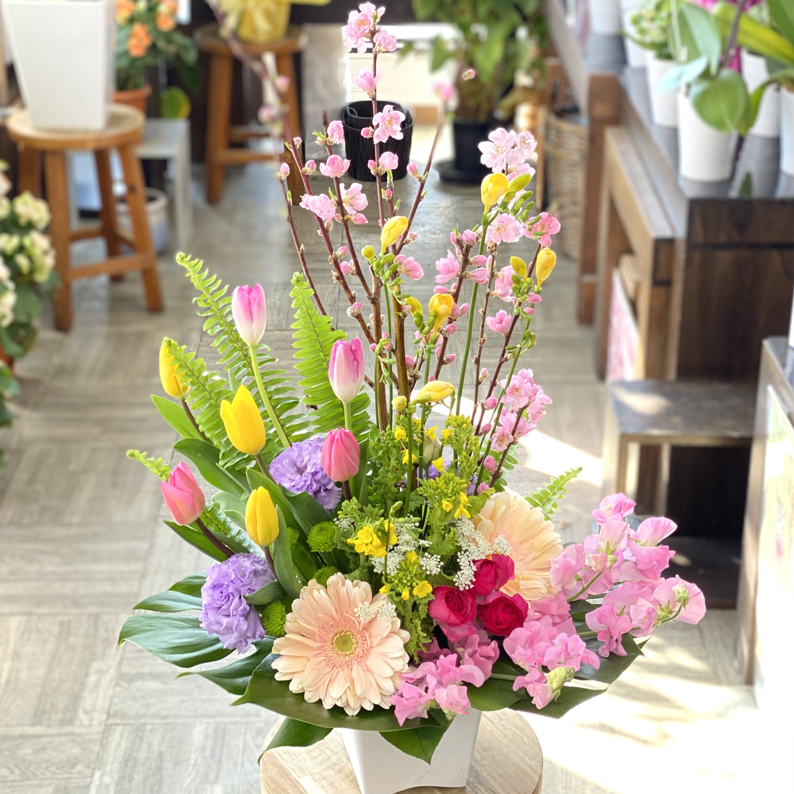 この時期におすすめの桃のお花の入ったアレンジメントです。桃の花やこの季節にぴったりなチューリップやスイートピーなどの明るい色合いのお花とあわせて上品にスタイリッシュに制作しました。もちろん厳選した花材を使用しておりますので、ご利用されたお客様から「大変花持ちが良い」と好評ですよ。あなたの大切な人へ…心を込めてこのアレンジを贈ってみてはいかがですか。さまざまなご用途にお使いいただけますよ。