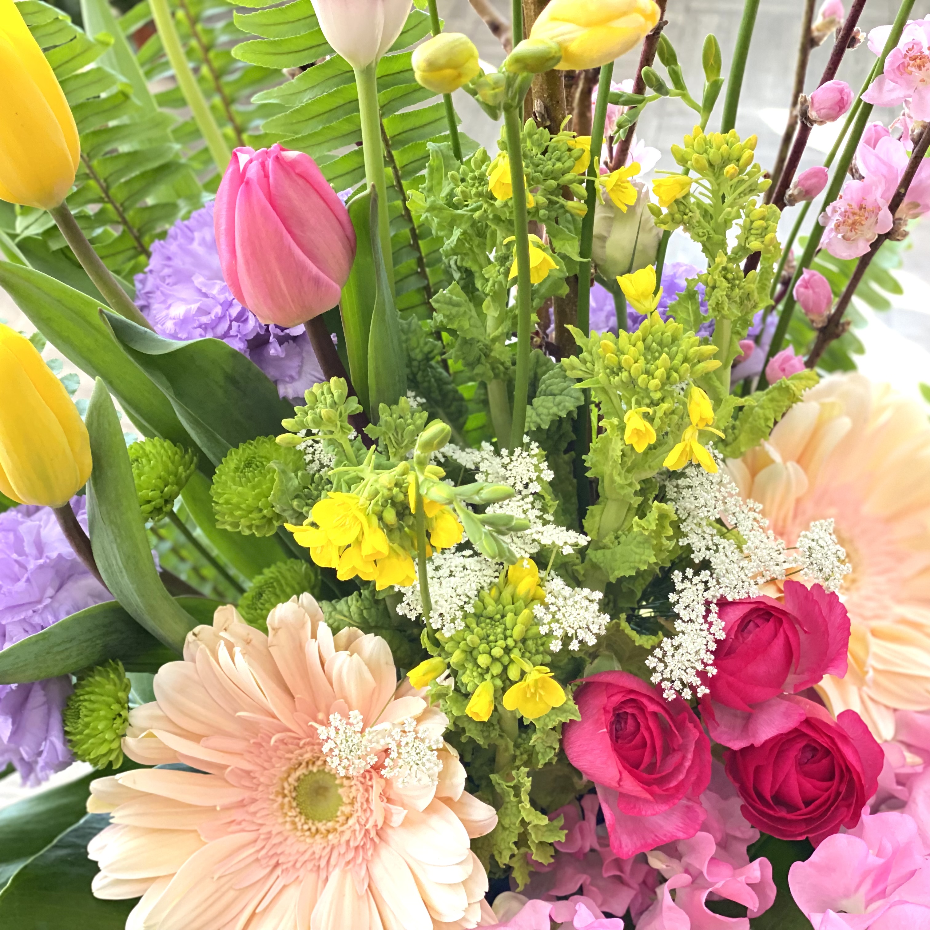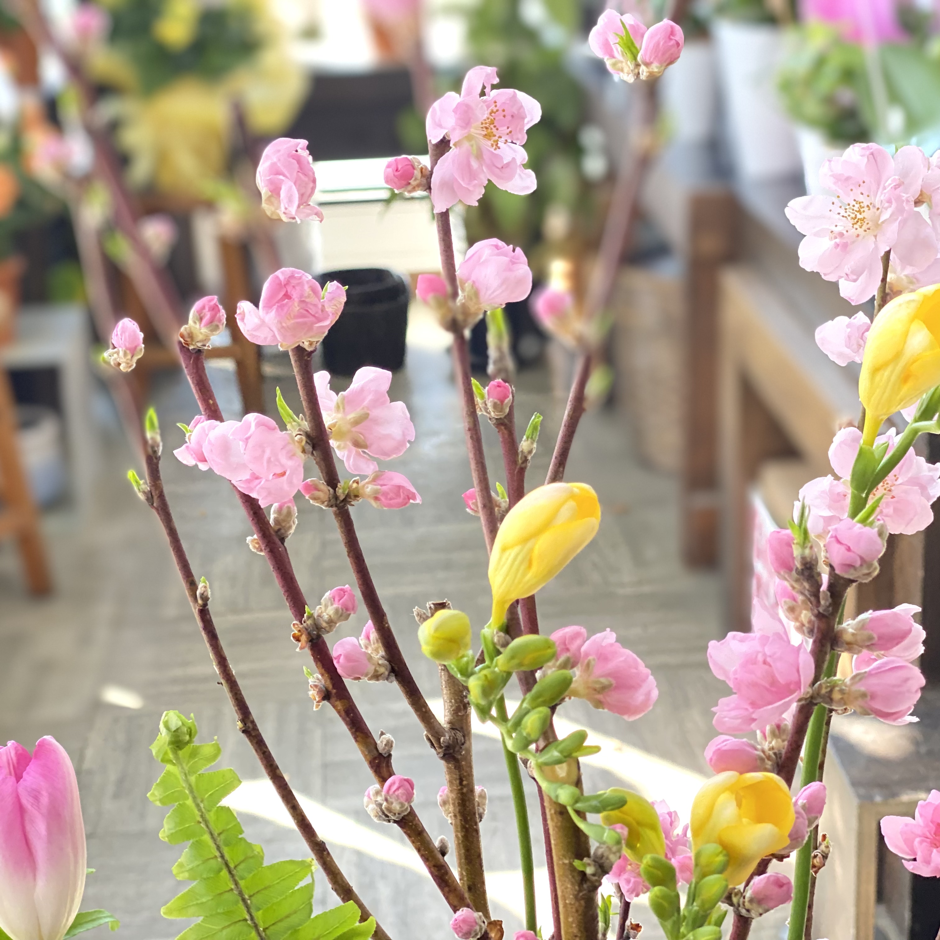 花材: メイン 桃の花、チューリップ、スイートピー、ラナンキュラス、ガーベラ、トルコギキョウなど その他 季節の小花、葉物類など