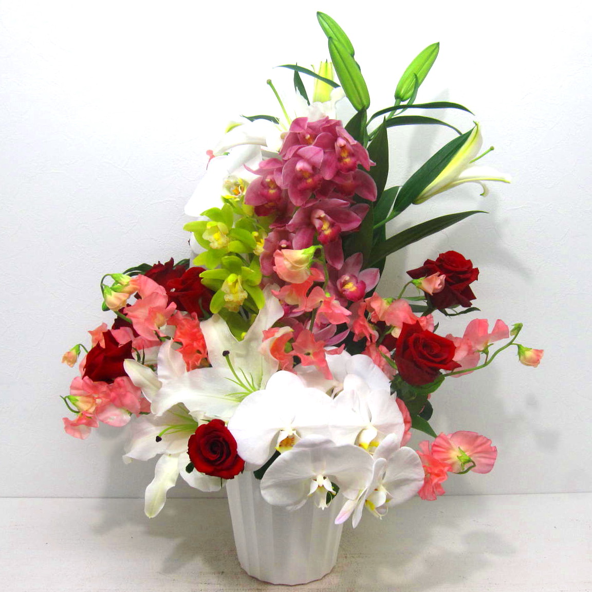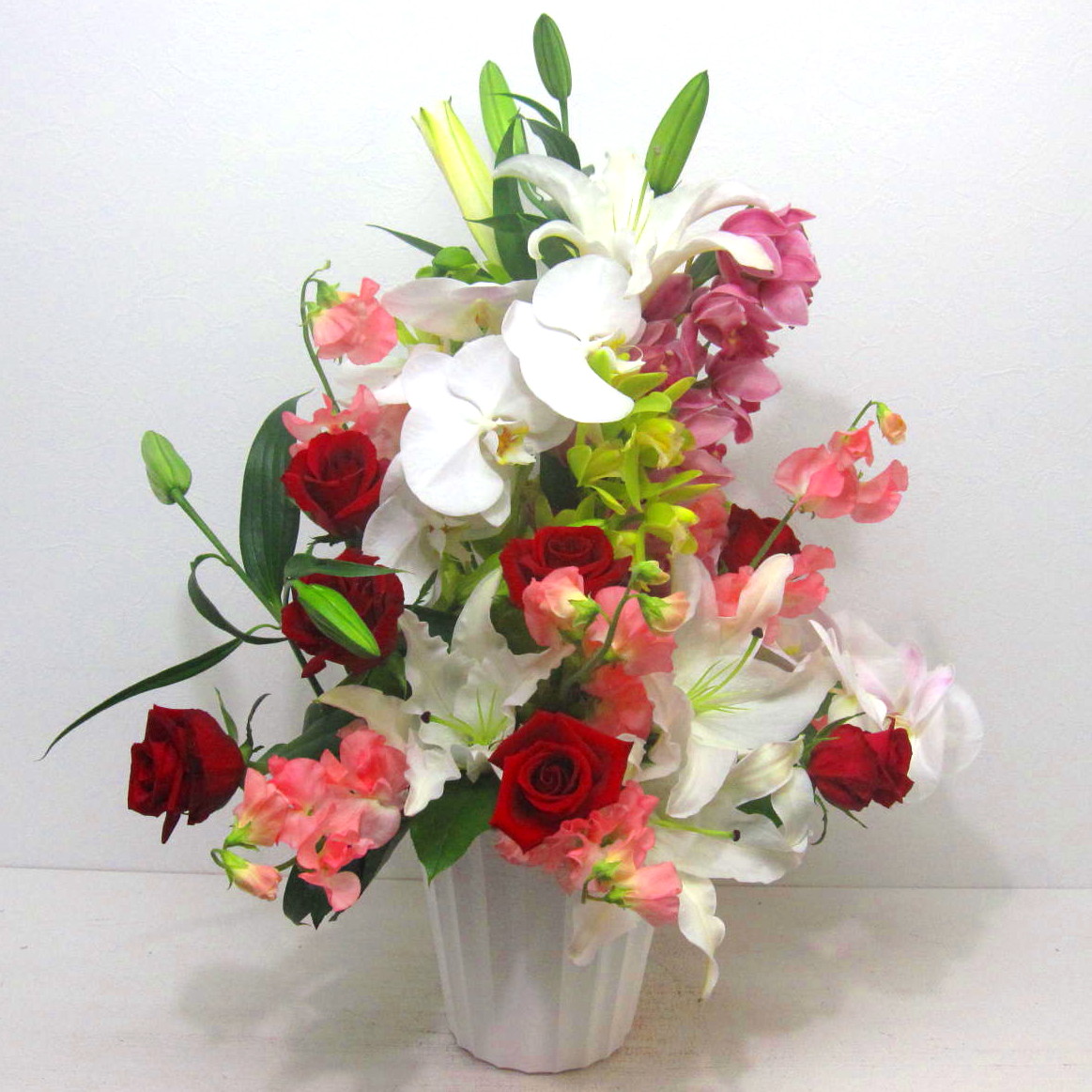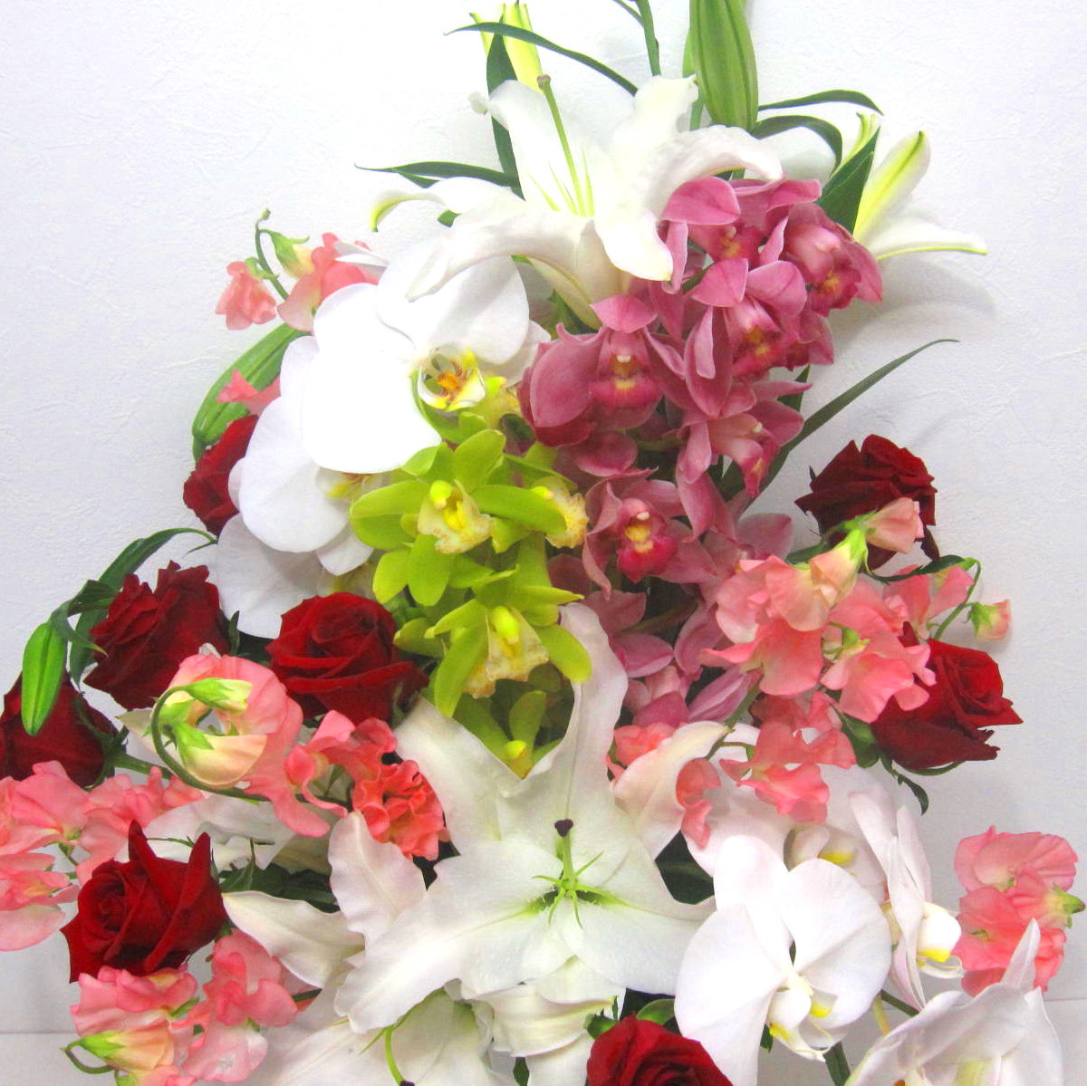 花材: メイン ユリ、バラ、コチョウラン、スイートピーなど その他 蘭系のお花、葉物類など