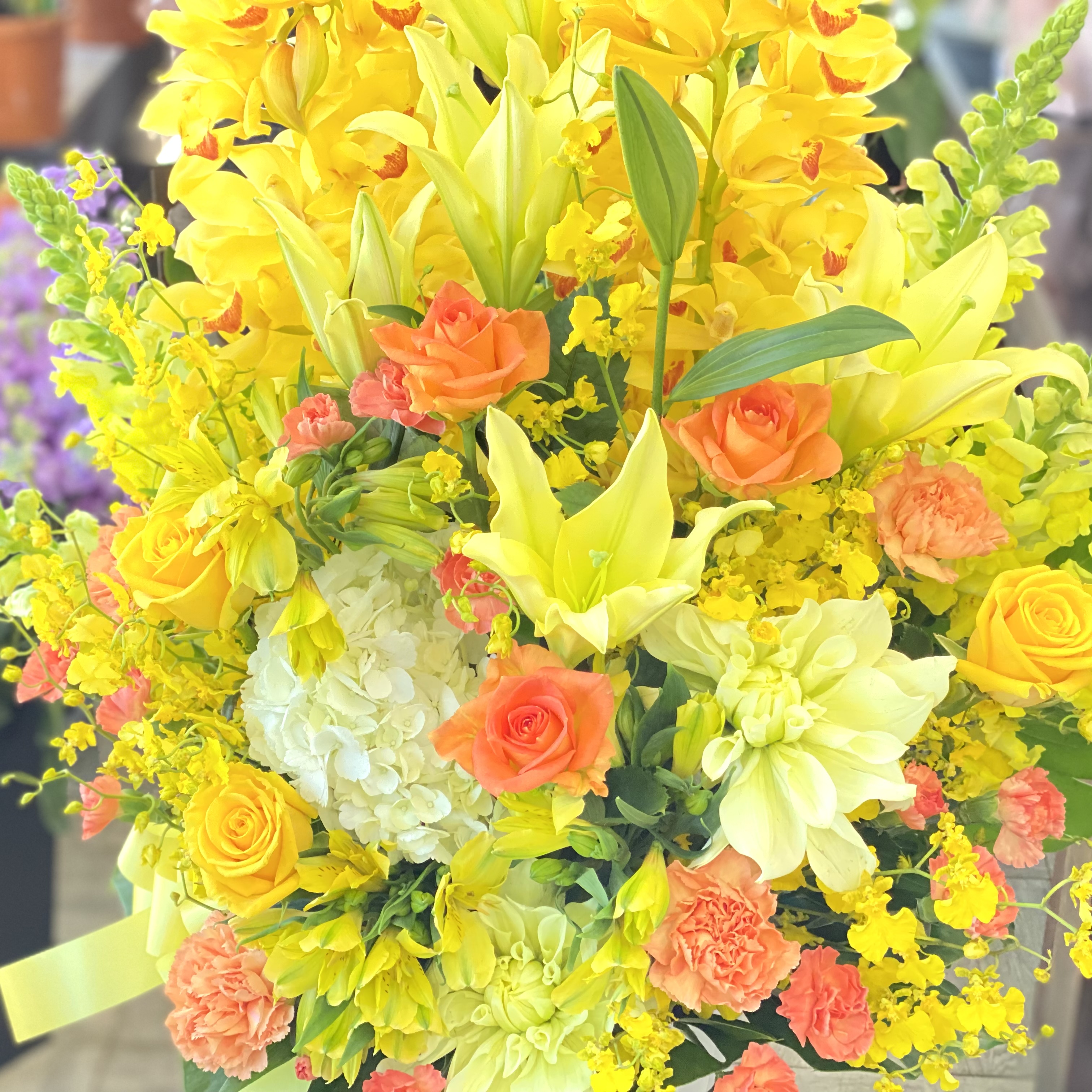 花材: メイン シンビジューム、ユリ、バラ、ダリア、カーネーション、アジサイなど その他 蘭系のお花、葉物類など