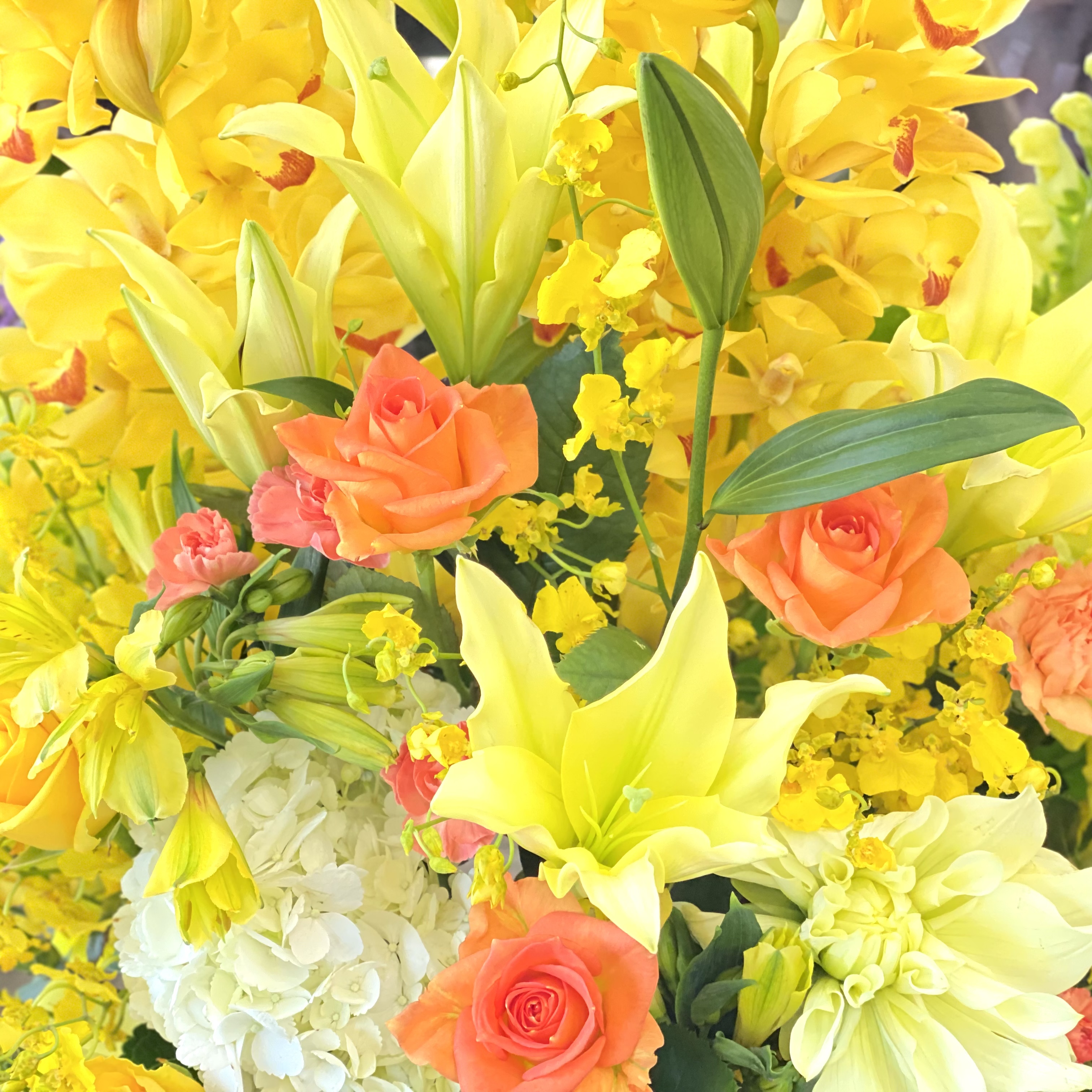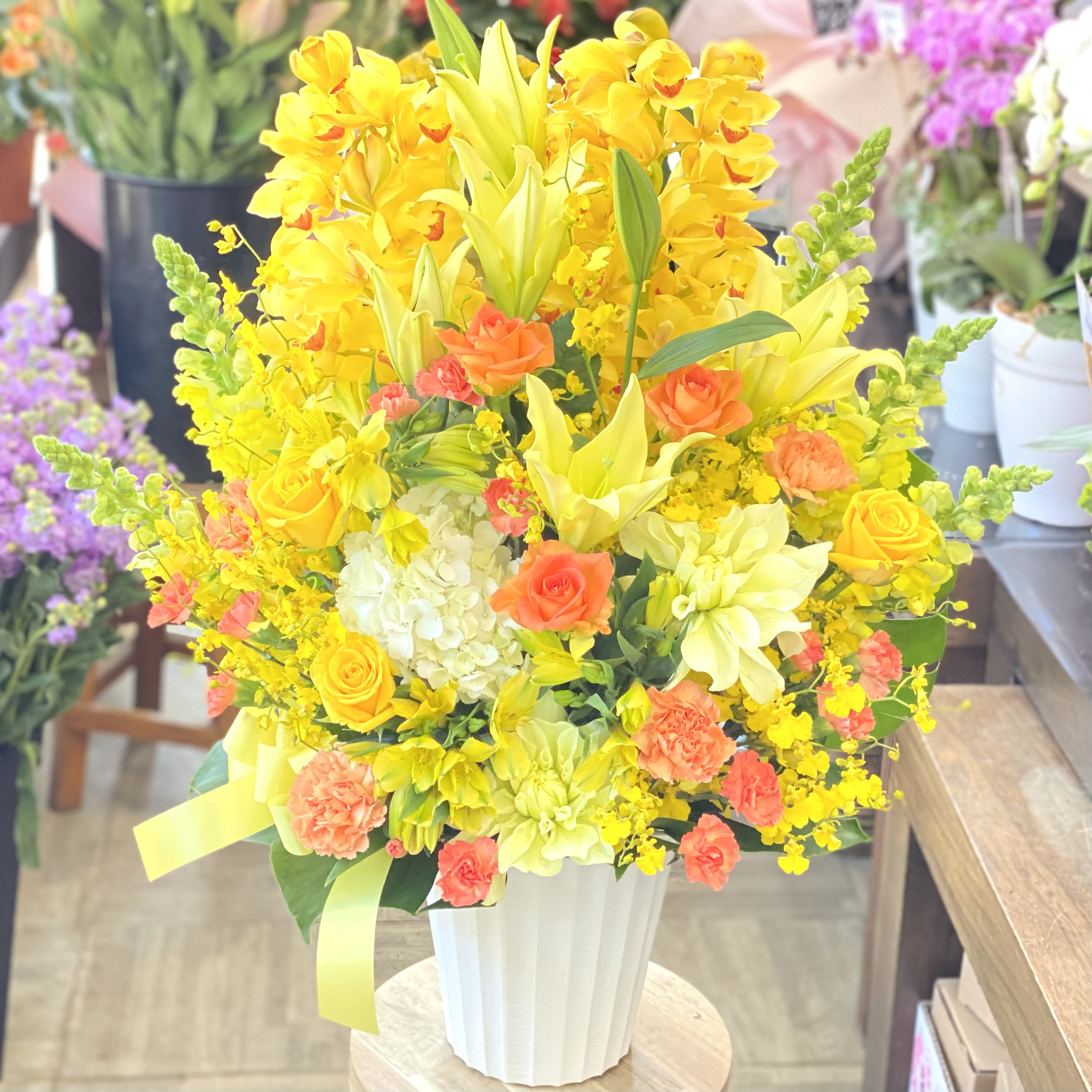 華やかな見栄えとビタミンカラーの明るさを兼ね備えたアレンジメントです。ユリやバラ、シンビジュームなどの存在感のあるお花を中心に黄色&オレンジ系に上品に制作致します。また、持ちの良いお花を中心に使っておりますので花持ちも良いでしょう。ご購入されたお客様から高い評価を頂いております。静岡県長泉町から日本全国【真心】込めてお届けいたします。さまざまなご用途に贈る贈り物としてオススメです。大切な方へ贈るフラワーギフトやプレゼントなら「花樹園オンラインドットコム」に是非、お任せ下さいませ。