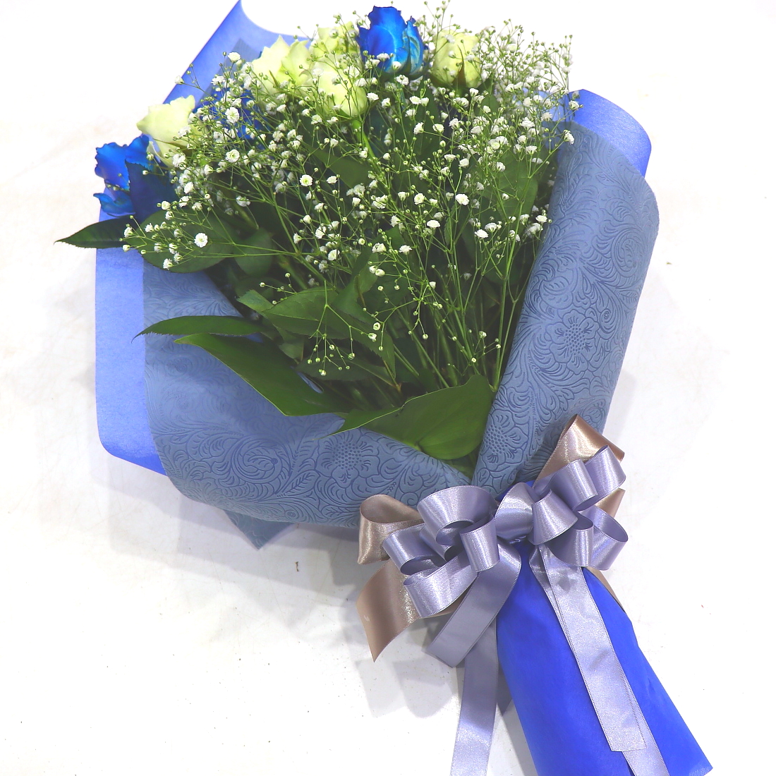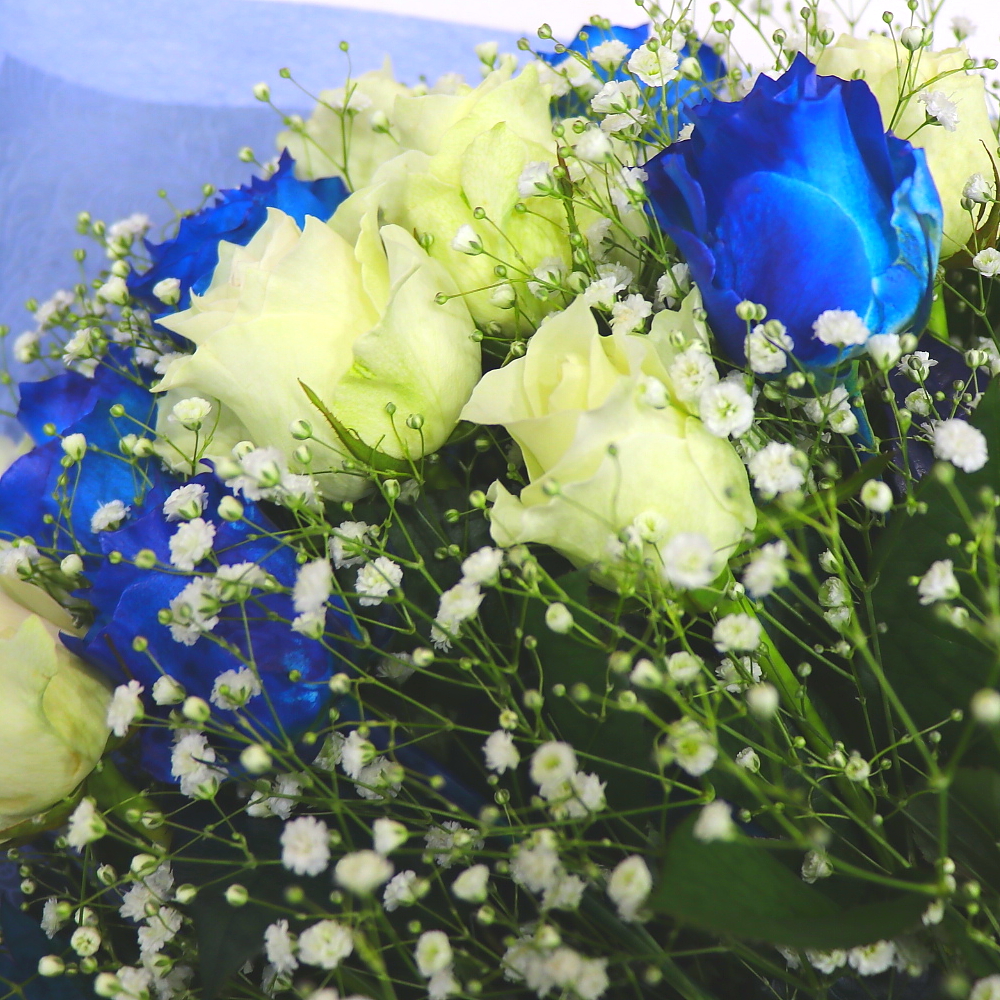 ちょっといつもとは違う贈り物にピッタリな花束。当店オリジナルで染めた青いバラと清楚な白いバラのコントラストがとても美しいです!【15時迄のご注文で翌日届きます】【ご希望の本数指定でもお作りします】※こちらの商品についてのご相談、ご質問等ございましたら(メール)または(お電話)にて承ります。