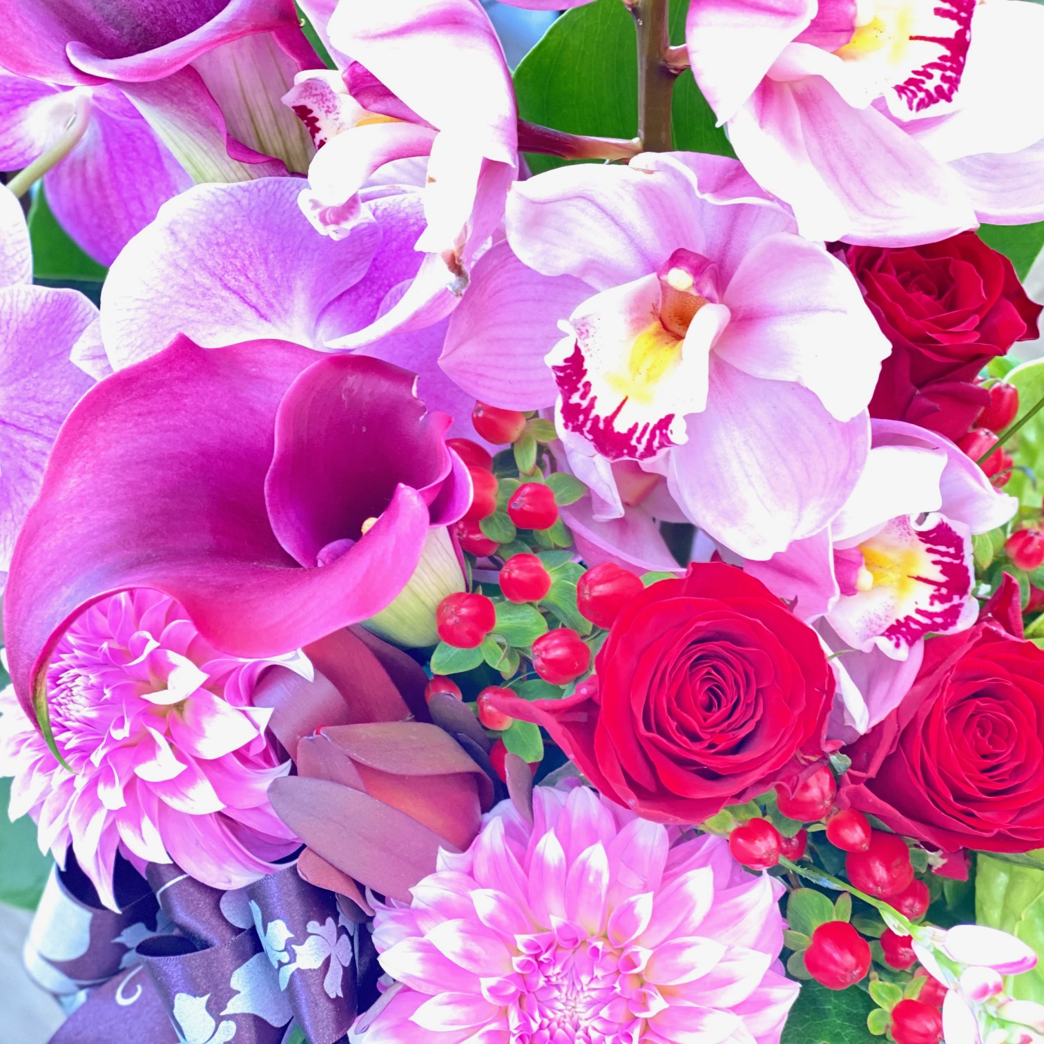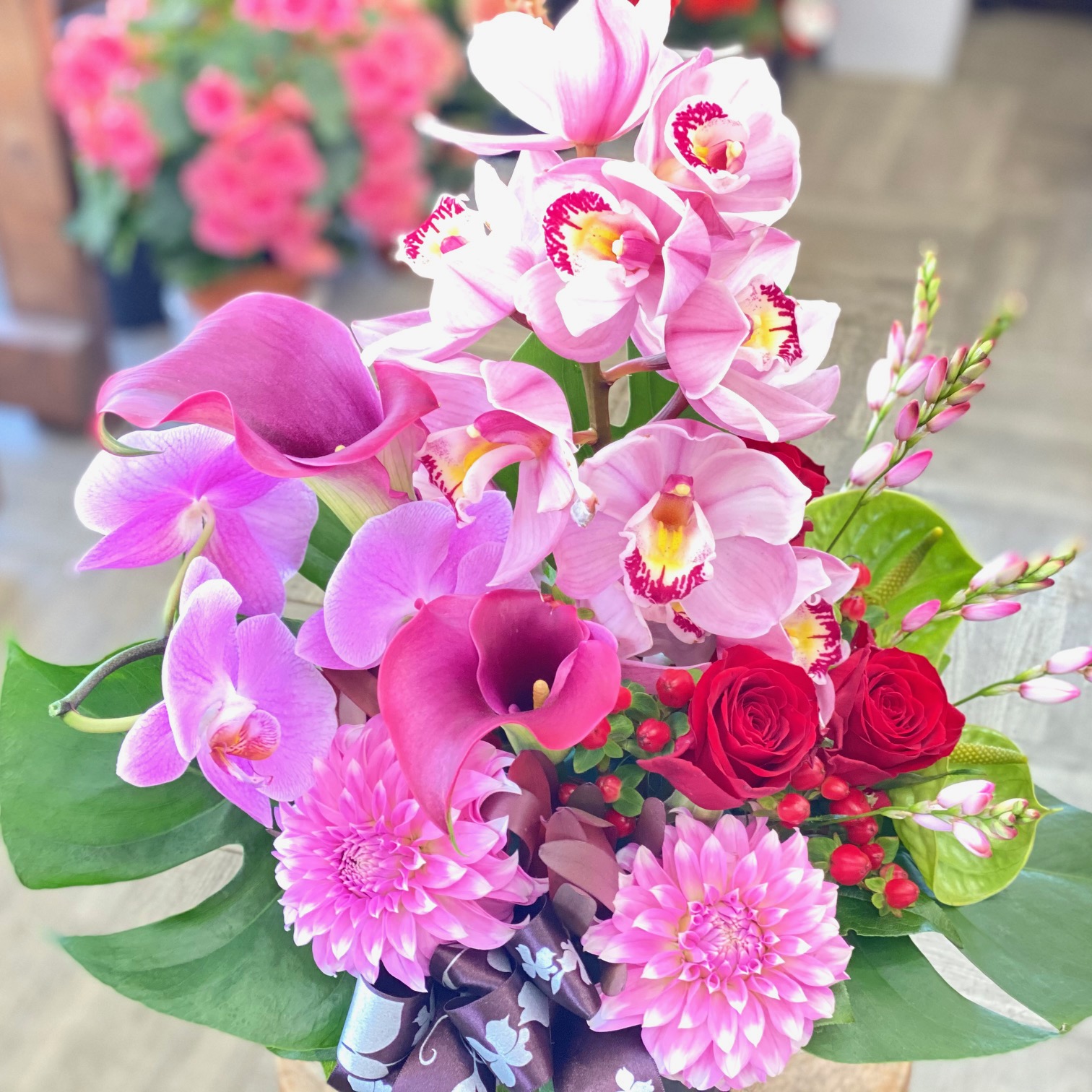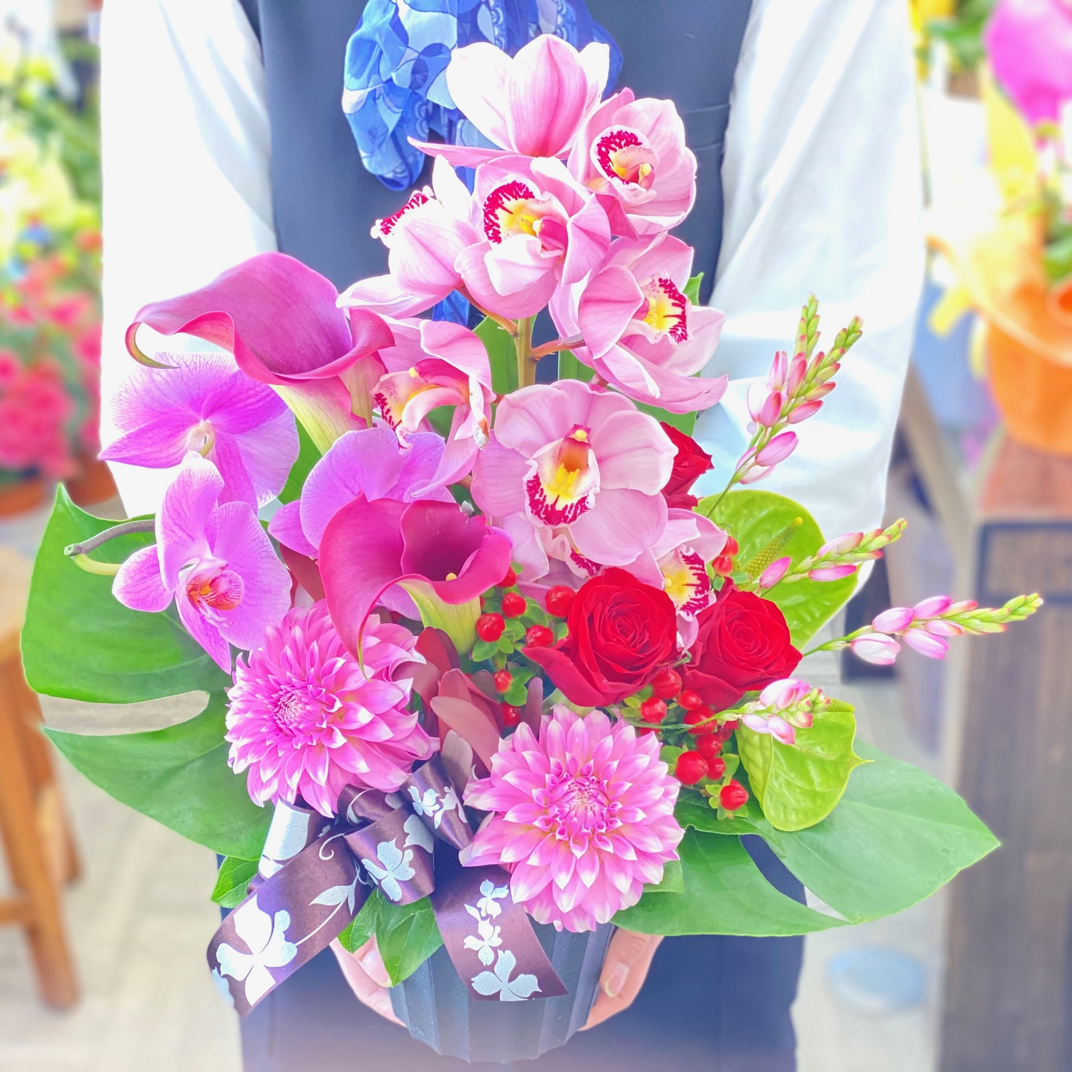 花材: メイン コチョウラン、シンビジューム、バラ、ダリアなど その他 実物類、葉物類など