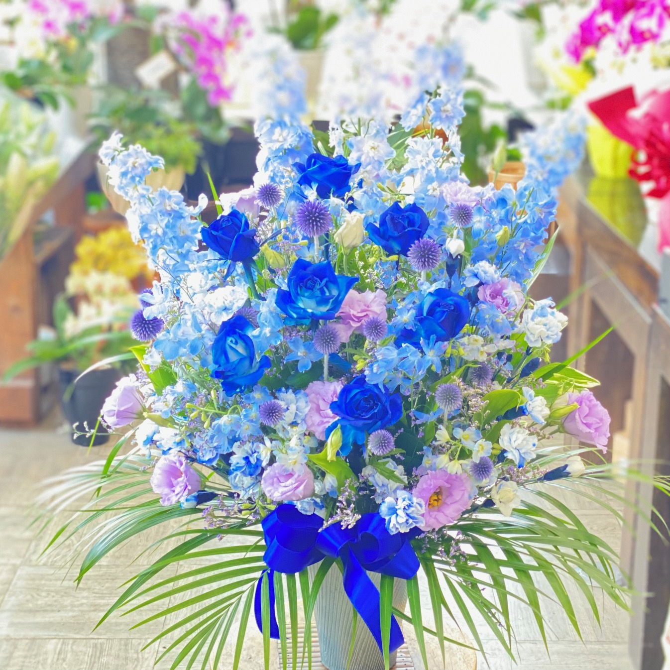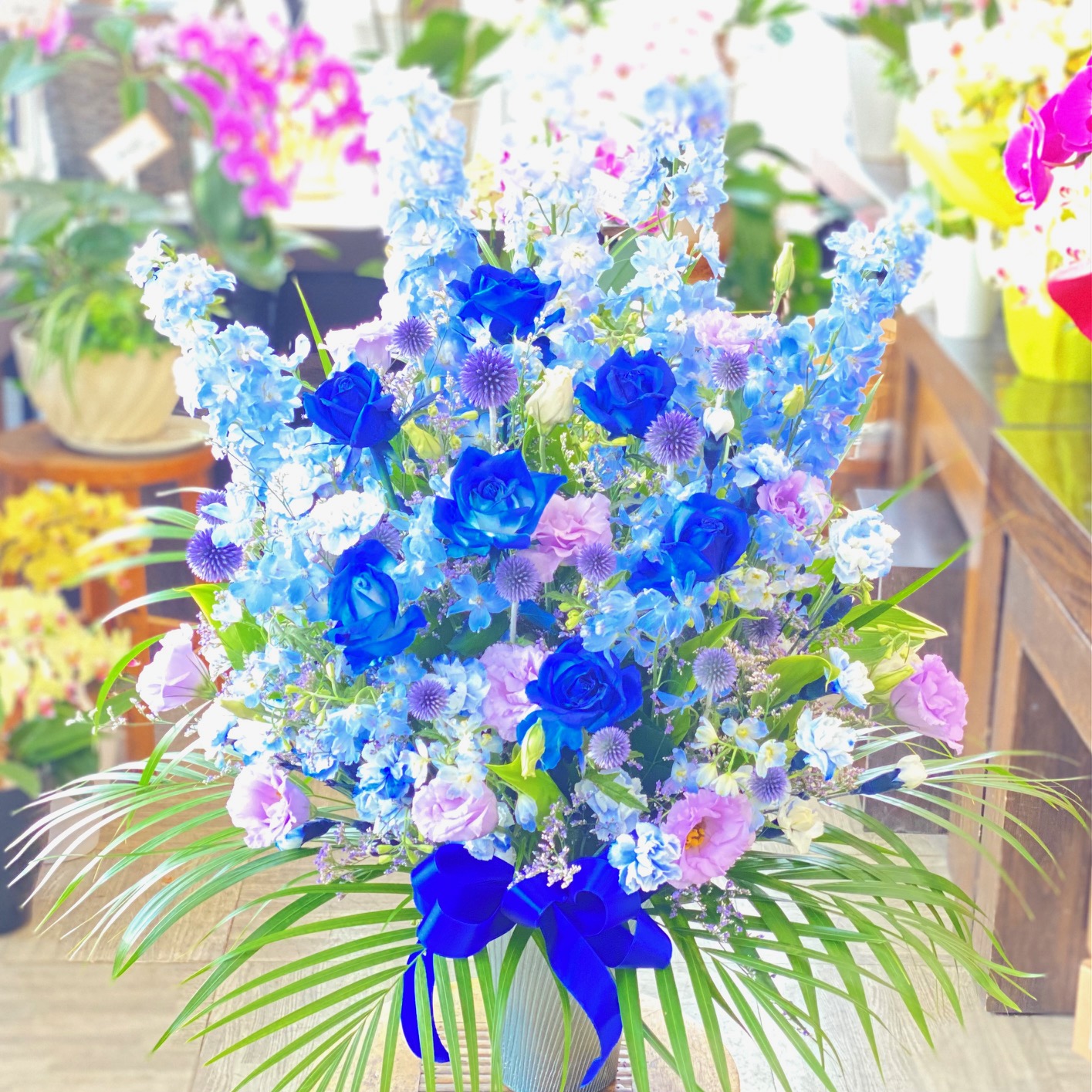 花材: メイン 【オリジナル染色】青いバラ、デルフィニューム、カーネーション、トルコギキョウ、季節のお花、葉物類など その他 綺麗に美しくラッピング致します。
