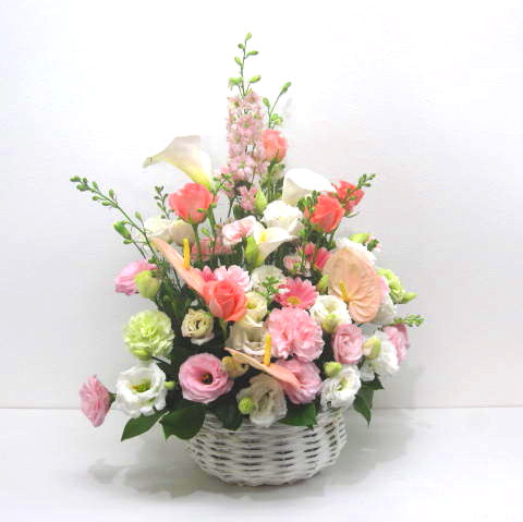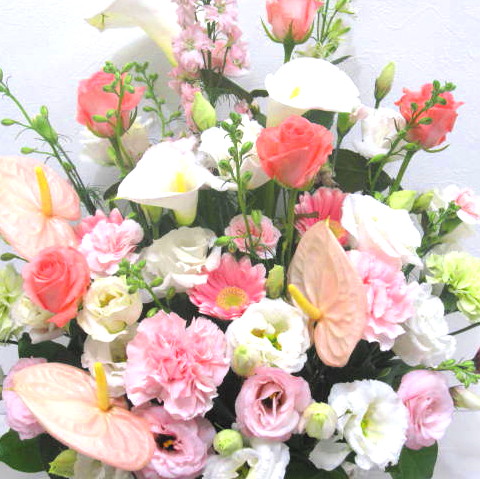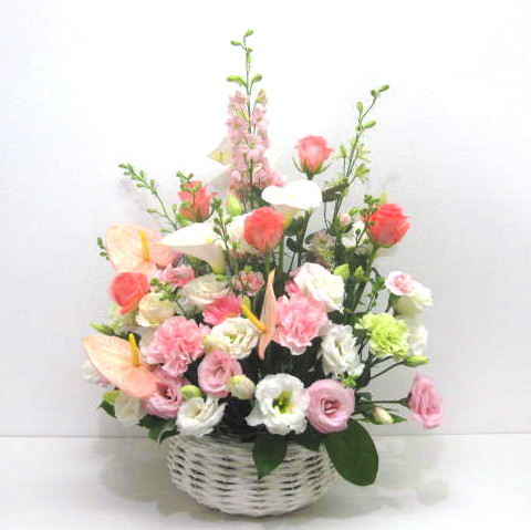 淡いピンクのお花を入れ明るく、アンスリュームやバラをいれ華やかさを演出。当店ではお客様の想い大切に【こころを込めて】お作りいたします。静岡県長泉町から手渡しお届けまたは宅急便で全国にお届けします。是非、さまざまな贈り物に。