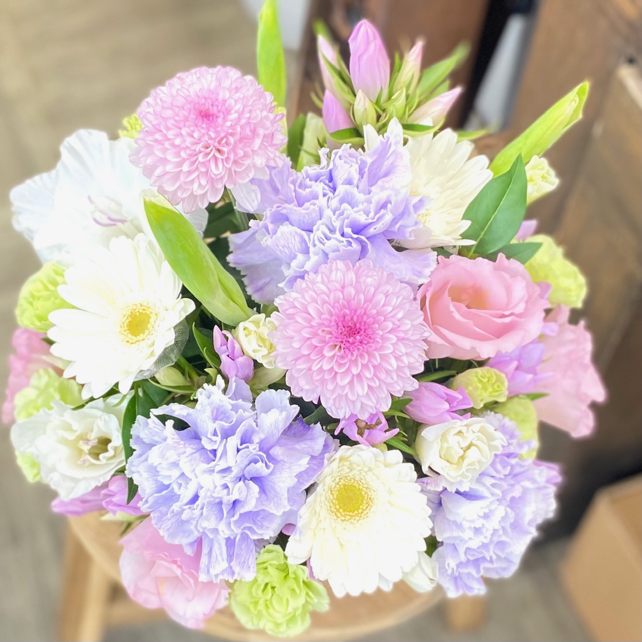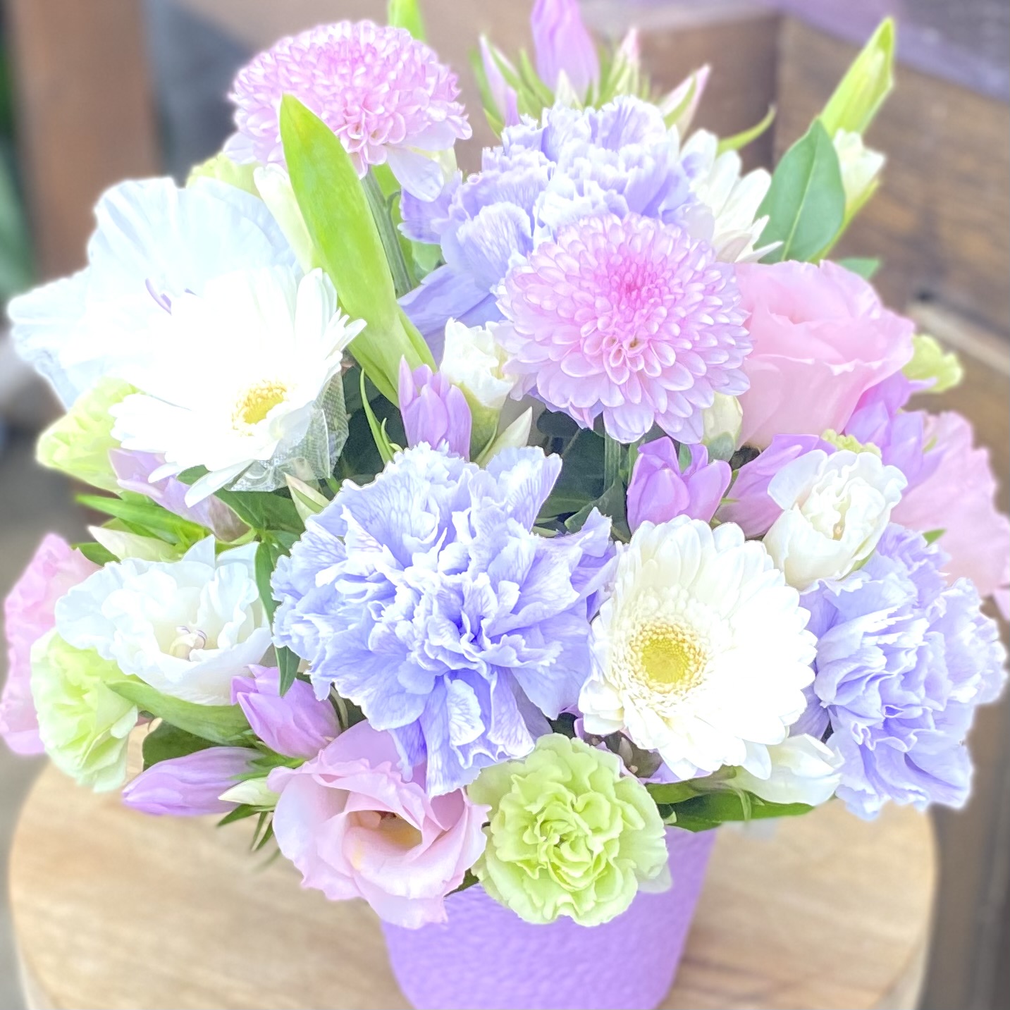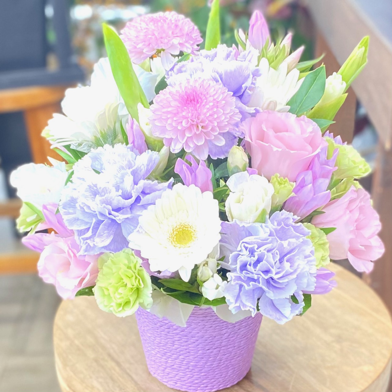 資材・ラッピング: 丸型パープルバスケット、吸水性スポンジ、フラワーケアカード(取扱説明書)