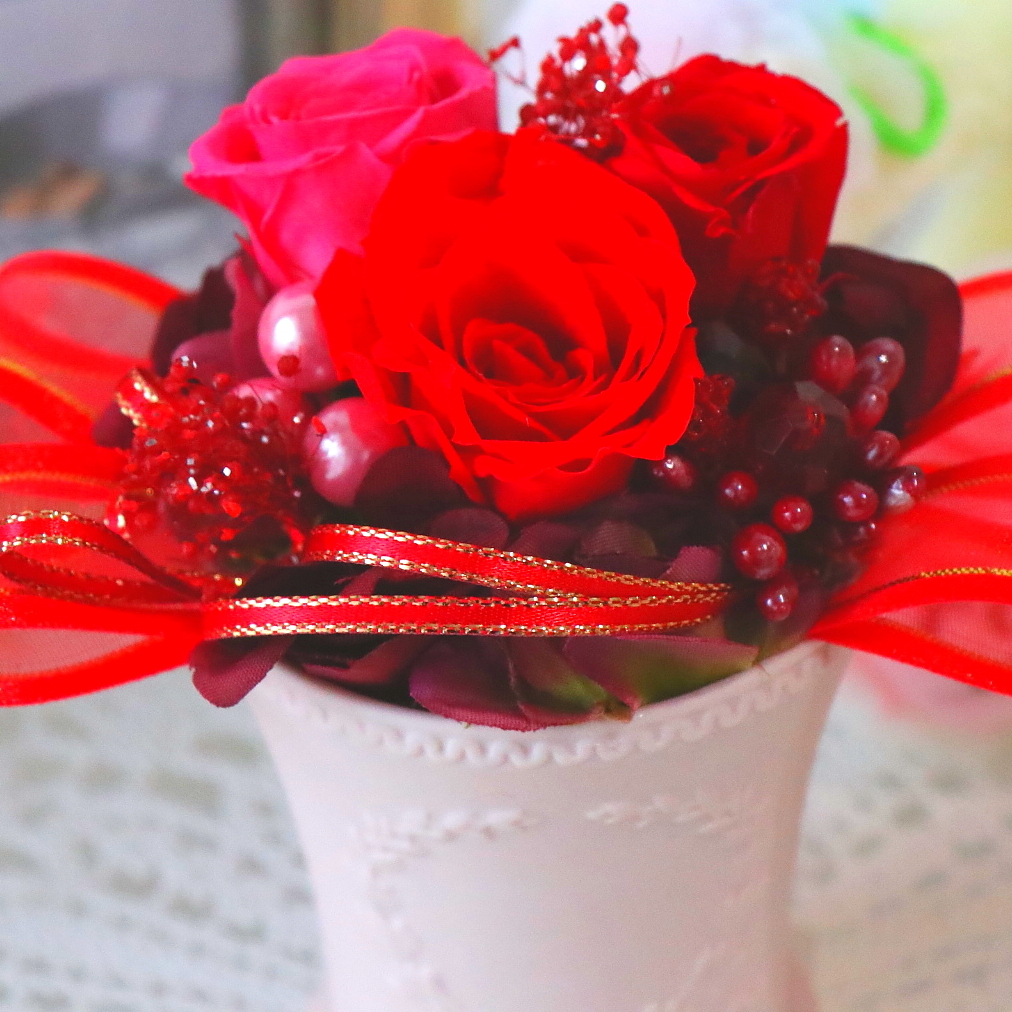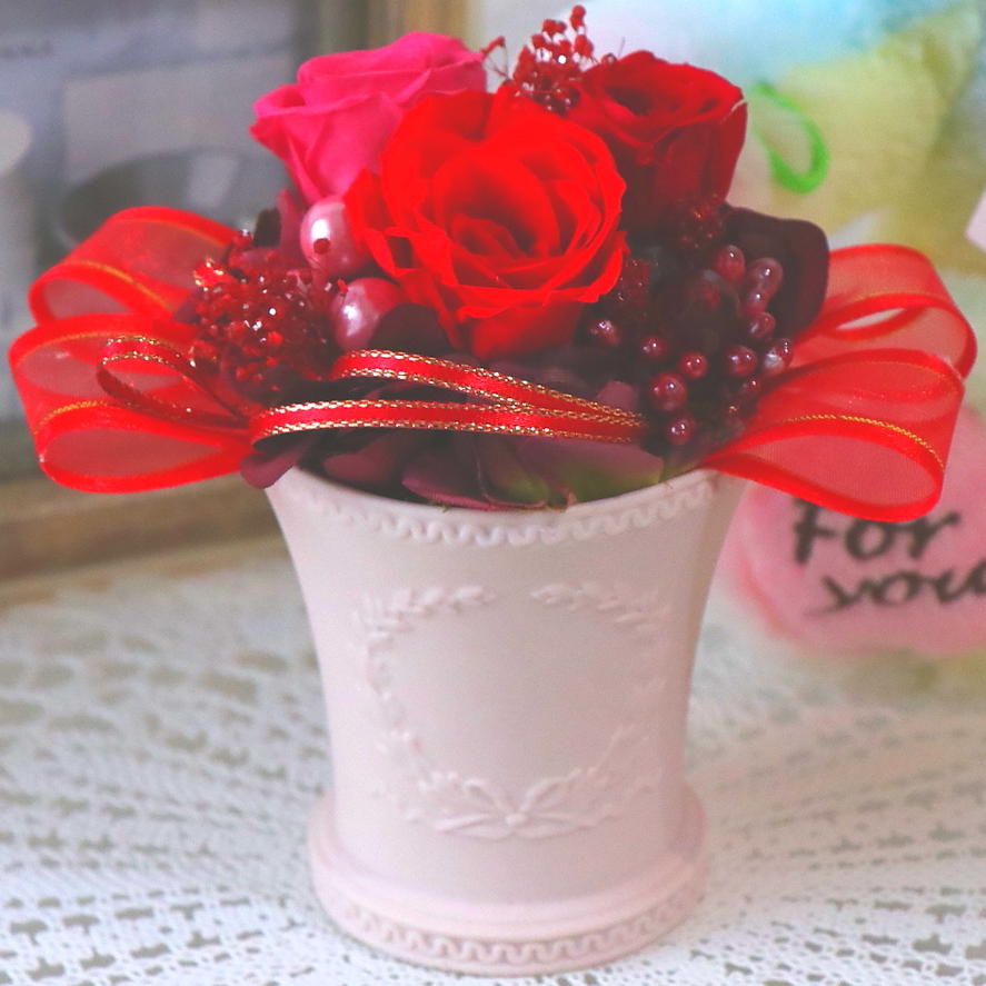 レッド系の色合いがとても可愛らしいプリザ―ドフラワーです。センスの良い小さな贈り物を大切な方にプレゼントしてみてはいかがでしょうか。【15時迄のご注文で翌日届きます】※こちらの商品についてのご相談、ご質問等ございましたら(メール)または(お電話)にて承ります。