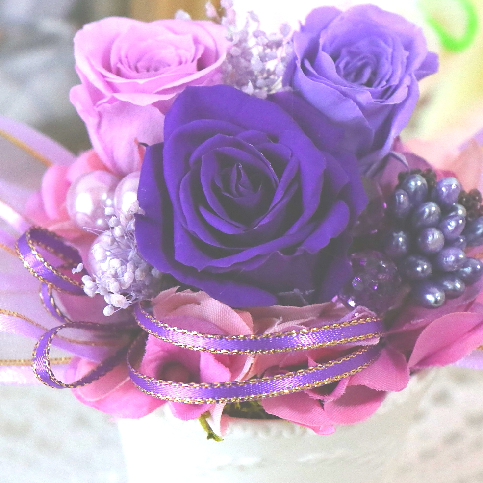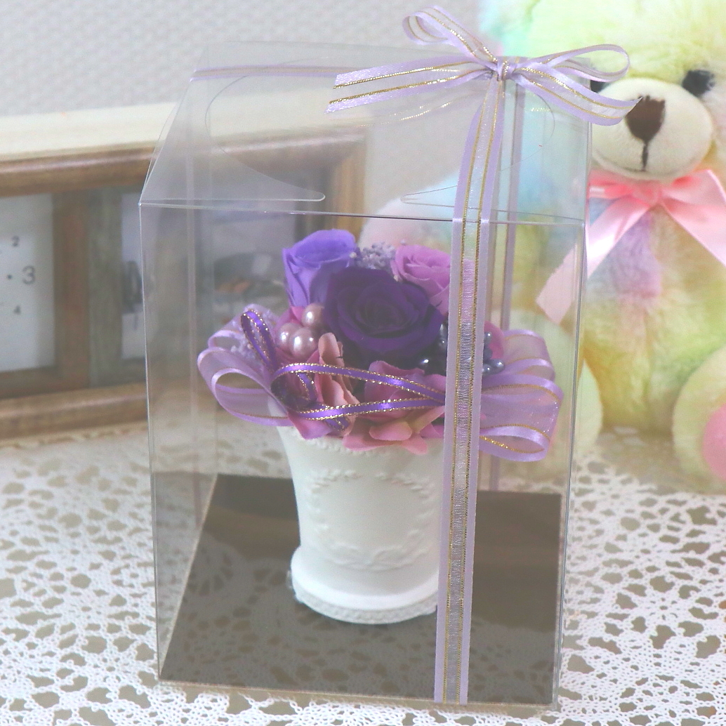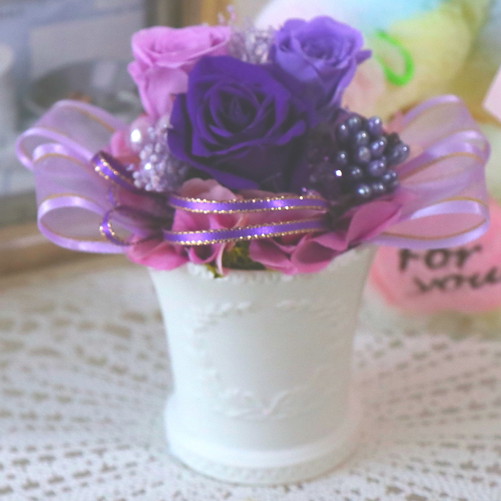 パープル系の色合いがとても可愛らしいプリザ―ドフラワーです。センスの良い小さな贈り物を大切な方にプレゼントしてみてはいかがでしょうか。【15時迄のご注文で翌日届きます】※こちらの商品についてのご相談、ご質問等ございましたら(メール)または(お電話)にて承ります。