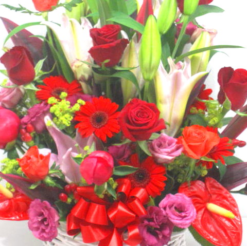 赤系のお花を入れた華やかなアレンジメントです。きっととびっきりに喜んでいたただけると思います。当店ではお客様の想い大切に【こころを込めて】お作りいたします。静岡県長泉町から手渡しお届けまたは宅急便で全国にお届けします。是非、さまざまな贈り物に。