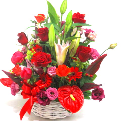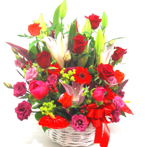 花材: メイン ユリ、バラ、ガーベラ、アンスリュームなど その他 葉物類など
