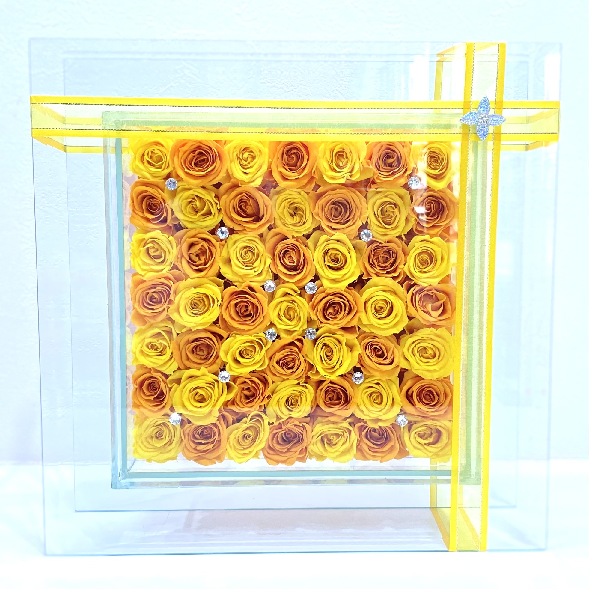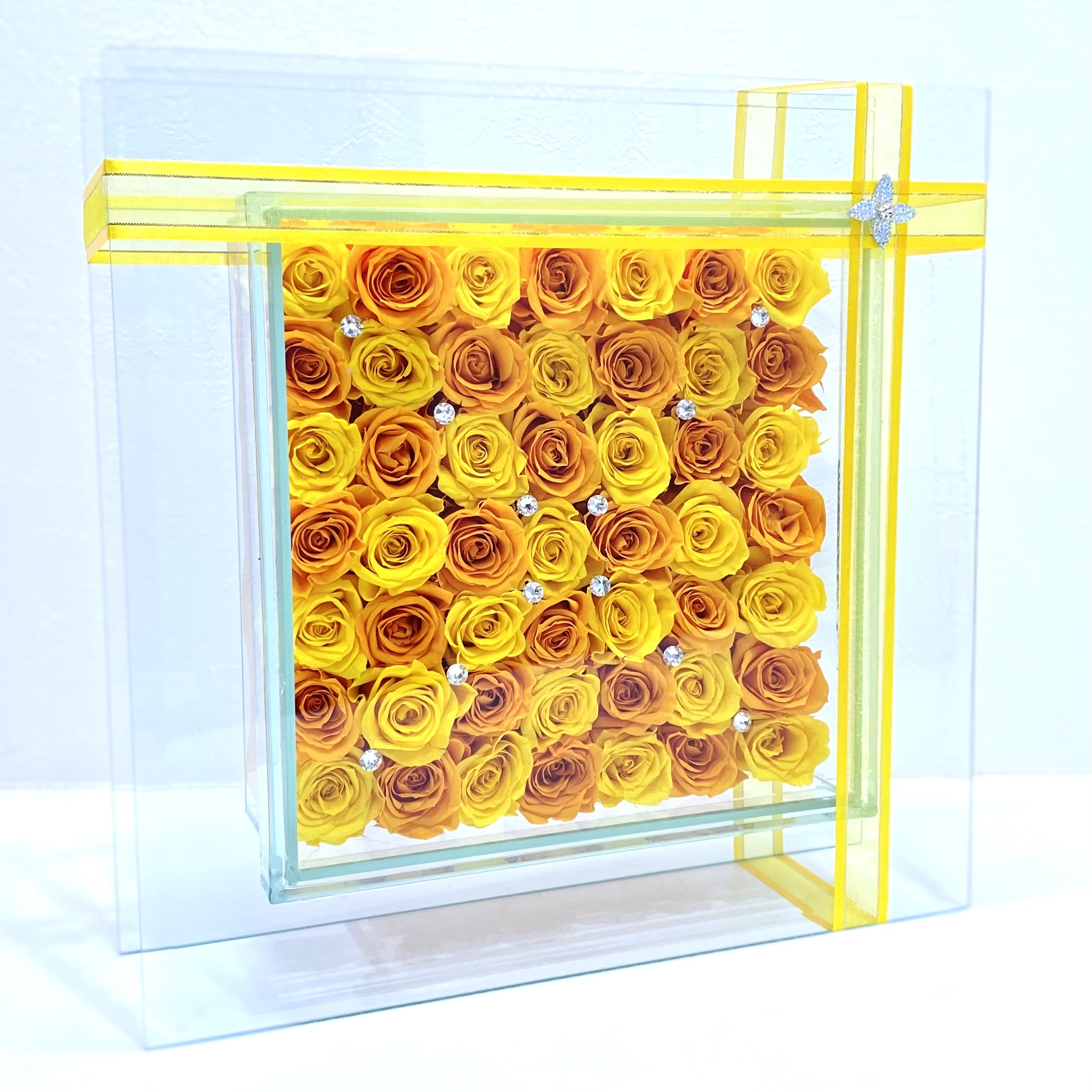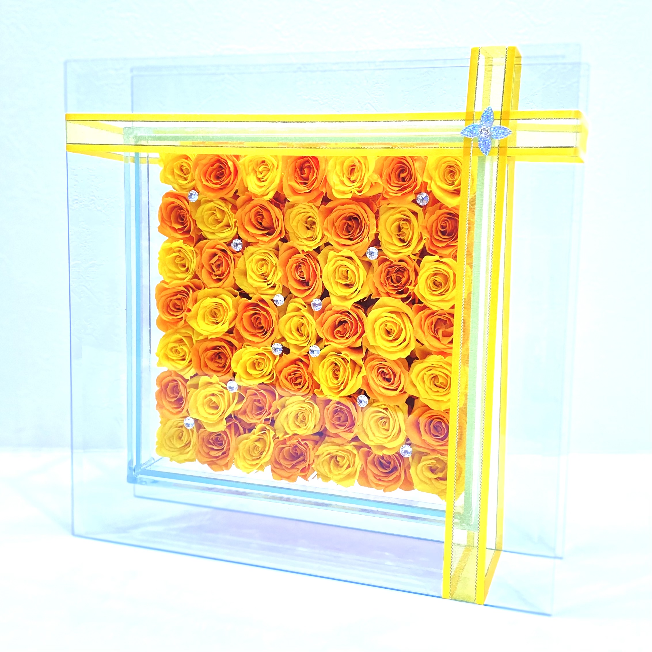 これ以上ない特別なプリザーブドフラワー。本当に大事な時、大切な日の贈り物にオススメです。スワロフスキーがガラスフレームと黄色&オレンジ系のプリザーブドローズを引き立てます。※こちらの商品についてのご相談、ご質問等ございましたら(メール)または(お電話)にて承ります。