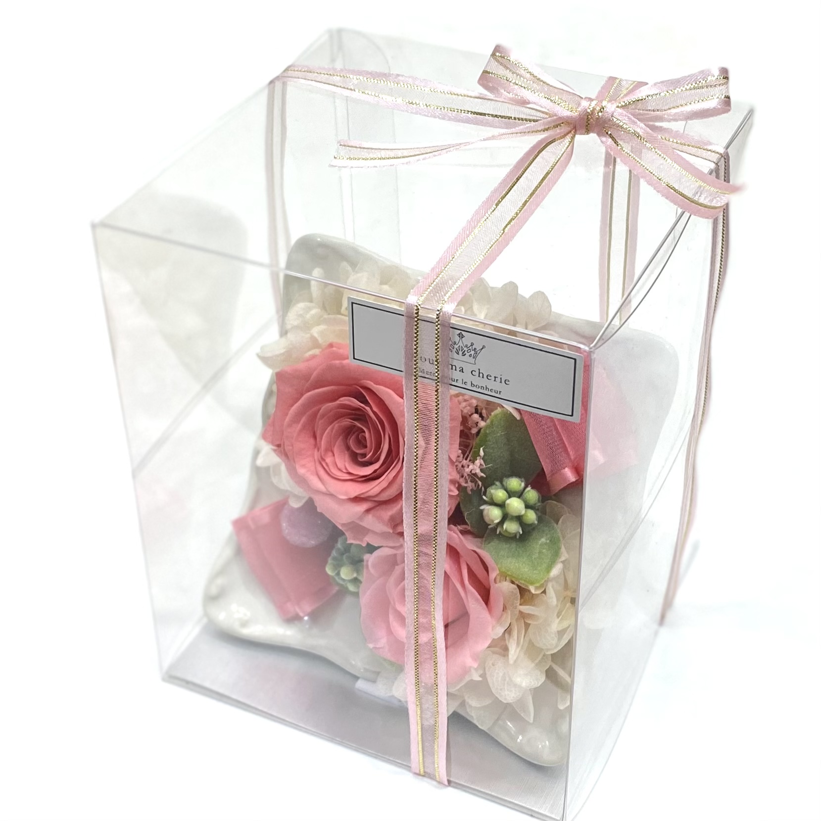 プリザーブドフラワーのバラを主体としたピンク系のプリザーブドフラワーです。一言「オシャレ!!」白い素敵なフレーム風の器にプリザ―ドローズを主体に制作しました。また、どんなお部屋に飾っても映えるのでご自宅用にインテリアとしても長く楽しめますよ。是非、想いを込めたフラワーギフトにいかがですか!?※プリザーブドフラワーとは、生花に特殊加工を施した、長期間楽しめるお花です。【クリアケース時サイズ:高さ13cm×幅11cm×奥行11cm】