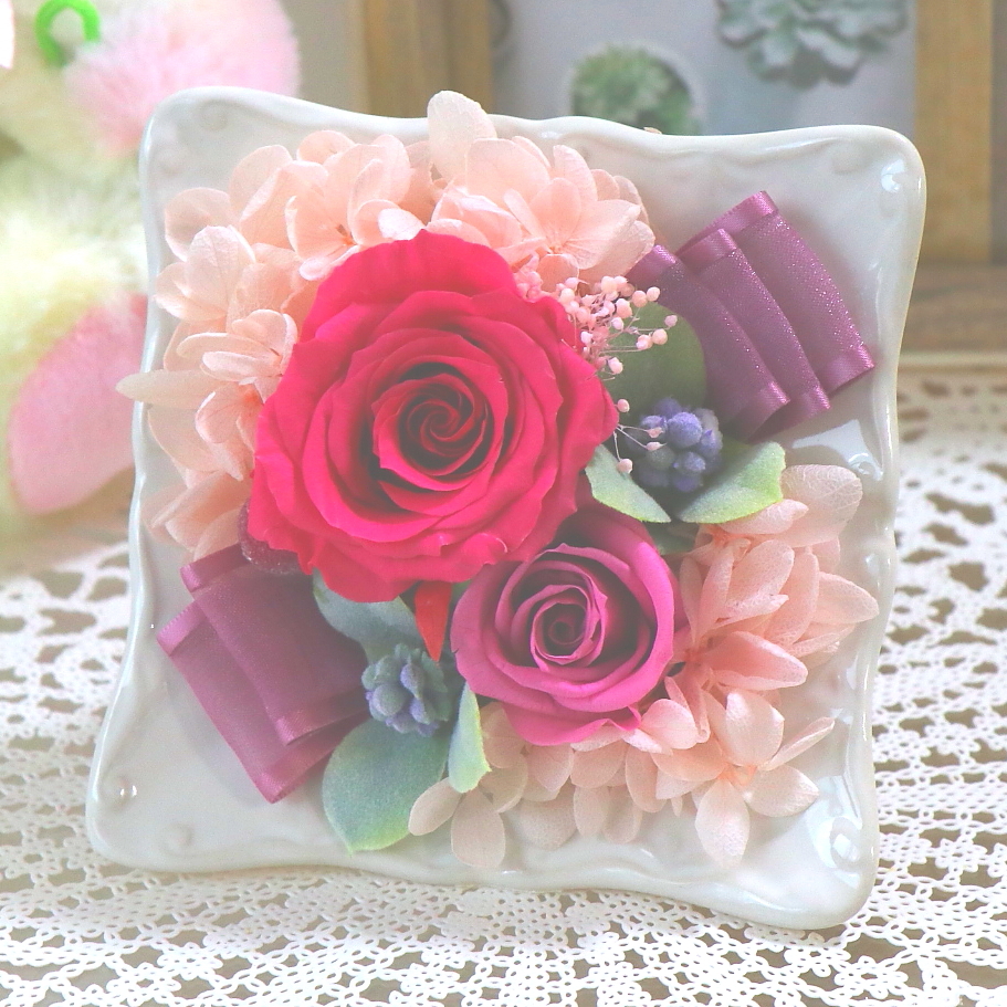 オシャレなスクエアのフレームにアレンジしたプリザ―ドフラワー。お部屋の空間にマッチし、どんな場所でもプリザ―ドローズが際立ちます。濃いピンク系のセンスの良い贈り物ですよ。【15時迄のご注文で翌日届きます】※こちらの商品についてのご相談、ご質問等ございましたら(メール)または(お電話)にて承ります。