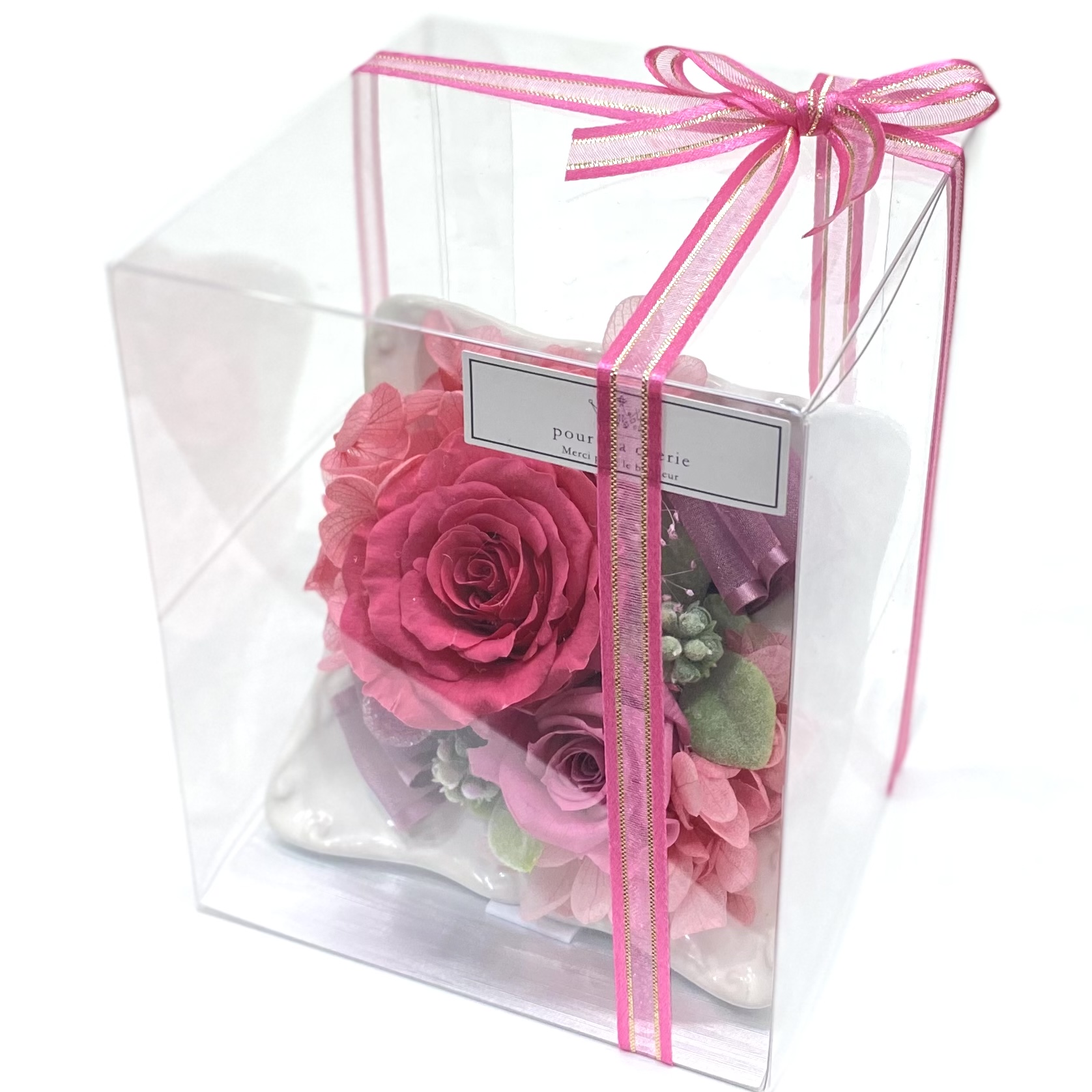 資材・ラッピング: フレーム風ヨーロピアン花器(ホワイト)、モニメントピック類、リボン、ドライフォーム、ギフト用クリアケース付き、フラワーケアカード(取扱説明書)
