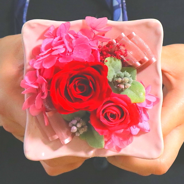 プリザーブドフラワーのバラを主体としたピンク&レッド系のプリザーブドフラワーです。一言「オシャレ!!」ピンクの素敵なフレーム風の器にプリザ―ドローズを主体に制作しました。また、どんなお部屋に飾っても映えるのでご自宅用にインテリアとしても長く楽しめますよ。是非、想いを込めたフラワーギフトにいかがですか!?※プリザーブドフラワーとは、生花に特殊加工を施した、長期間楽しめるお花です。【クリアケース時サイズ:高さ13cm×幅11cm×奥行11cm】