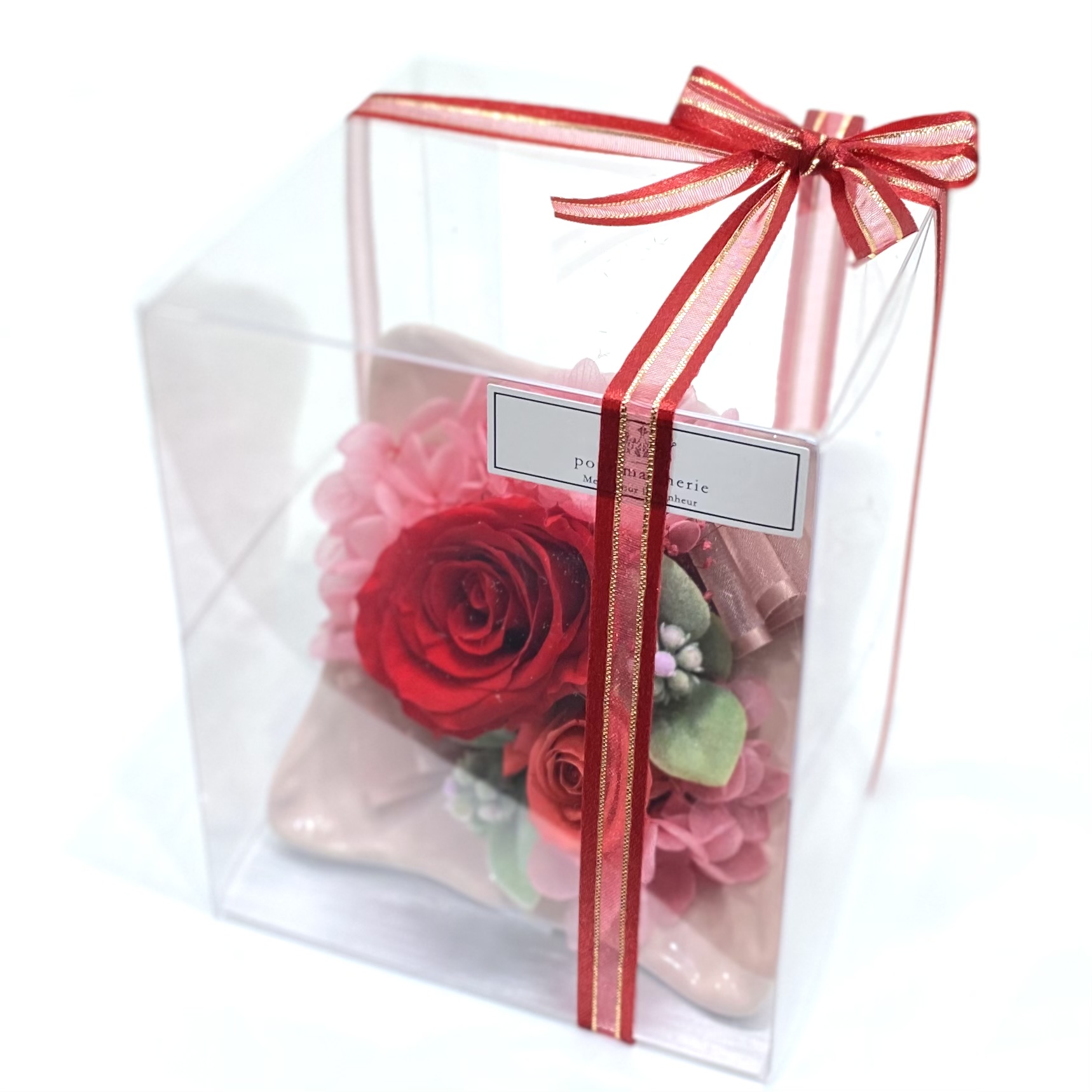 資材・ラッピング: フレーム風ヨーロピアン花器(ピンク)、モニメントピック類、リボン、ドライフォーム、ギフト用クリアケース付き、フラワーケアカード(取扱説明書)