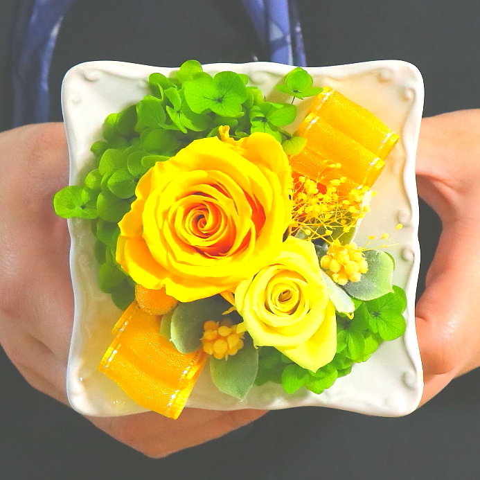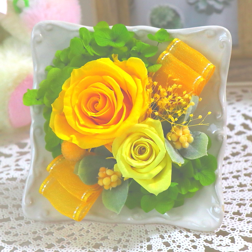 オシャレなスクエアのフレームにアレンジしたプリザ―ドフラワー。お部屋の空間にマッチし、どんな場所でもプリザ―ドローズが際立ちます。イエロー系のセンスの良い贈り物ですよ。【15時迄のご注文で翌日届きます】※こちらの商品についてのご相談、ご質問等ございましたら(メール)または(お電話)にて承ります。