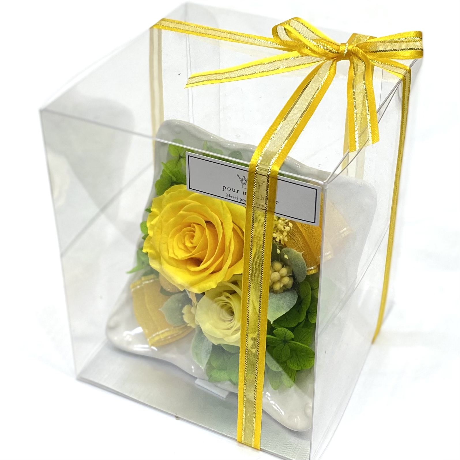 プリザーブドフラワーのバラを主体としたイエロー系のプリザーブドフラワーです。一言「オシャレ!!」白い素敵なフレーム風の器にプリザ―ドローズを主体に制作しました。また、どんなお部屋に飾っても映えるのでご自宅用にインテリアとしても長く楽しめますよ。是非、想いを込めたフラワーギフトにいかがですか!?※プリザーブドフラワーとは、生花に特殊加工を施した、長期間楽しめるお花です。【クリアケース時サイズ:高さ13cm×幅11cm×奥行11cm】