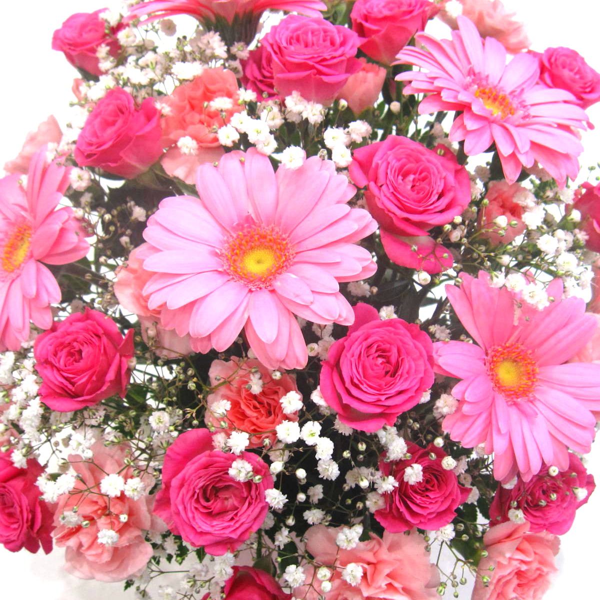 花材: メイン ガーベラ、ミニバラ、ミニカーネーションなど その他 かすみ草、葉物類など