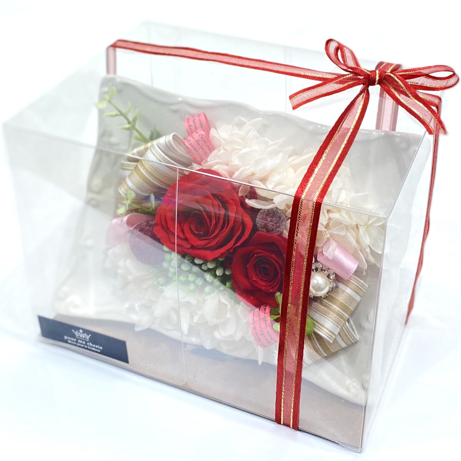 資材・ラッピング: フレーム風ヨーロピアン花器(ホワイト)、モニメントピック類、リボン、ドライフォーム、ギフト用クリアケース付き、フラワーケアカード(取扱説明書)