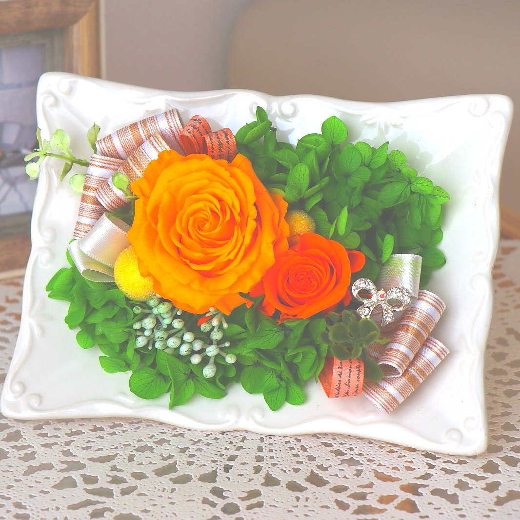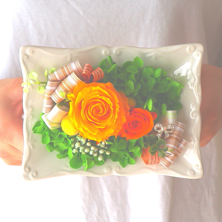 長方形のオシャレなフレームにマスカットオレンジ系のプリザ―ドローズアレンジしたプリザ―ドフラワー。お部屋の空間にマッチし、より立体的なアレンジがお部屋を彩ります。センスの良い贈り物ですよ。【15時迄のご注文で翌日届きます】※こちらの商品についてのご相談、ご質問等ございましたら(メール)または(お電話)にて承ります。