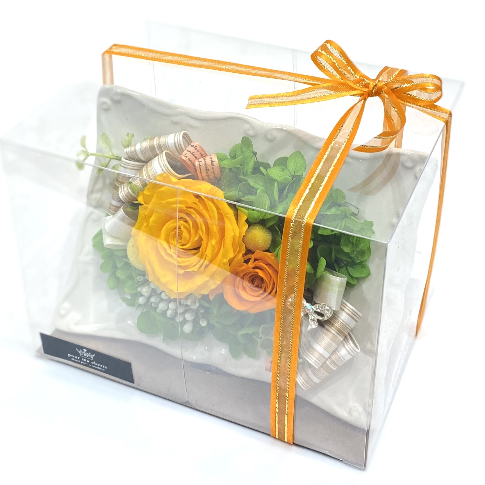 プリザーブドフラワーのバラを主体としたマスカットオレンジ系のプリザーブドフラワーです。少しサイズの大きいフレームアレンジ。一言「オシャレ!!」白い素敵なフレーム風の器にプリザ―ドローズを主体に制作しました。また、どんなお部屋に飾っても映えるのでご自宅用にインテリアとしても長く楽しめますよ。是非、想いを込めたフラワーギフトにいかがですか!?※プリザーブドフラワーとは、生花に特殊加工を施した、長期間楽しめるお花です。【クリアケース時サイズ:高さ12cm×幅16cm×奥行12cm】