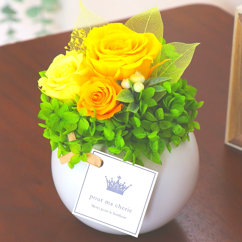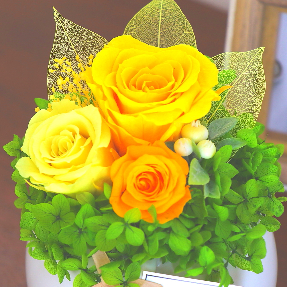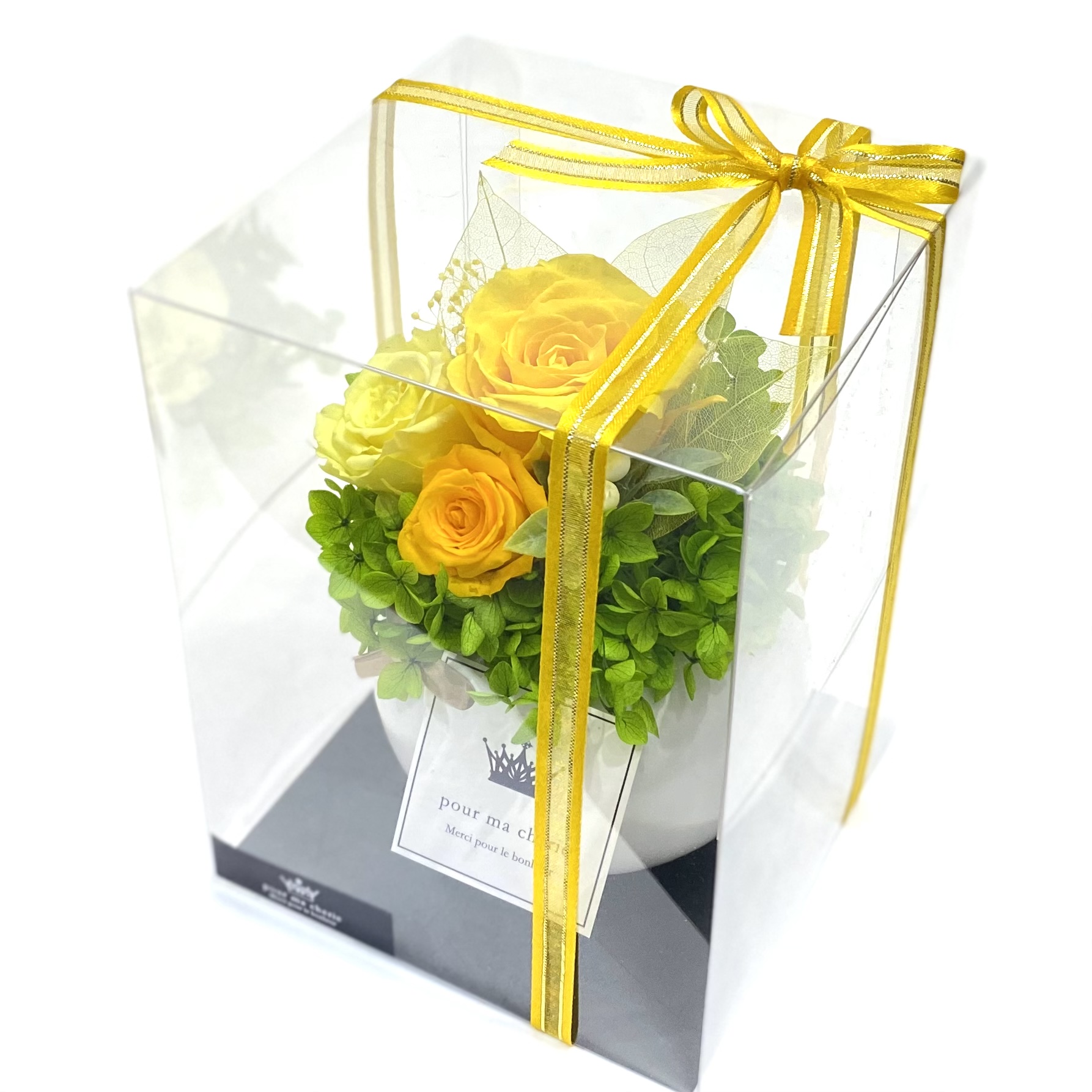 プリザーブドフラワーのバラを主体としたイエロー系のプリザーブドフラワーです。ボリューム感もありおすすめです。また、どんなお部屋に飾っても映えるのでご自宅用にインテリアとしても長く楽しめますよ。是非、想いを込めたフラワーギフトにいかがですか!?※プリザーブドフラワーとは、生花に特殊加工を施した、長期間楽しめるお花です。【クリアケース時サイズ:高さ16cm×幅12cm×奥行12cm】