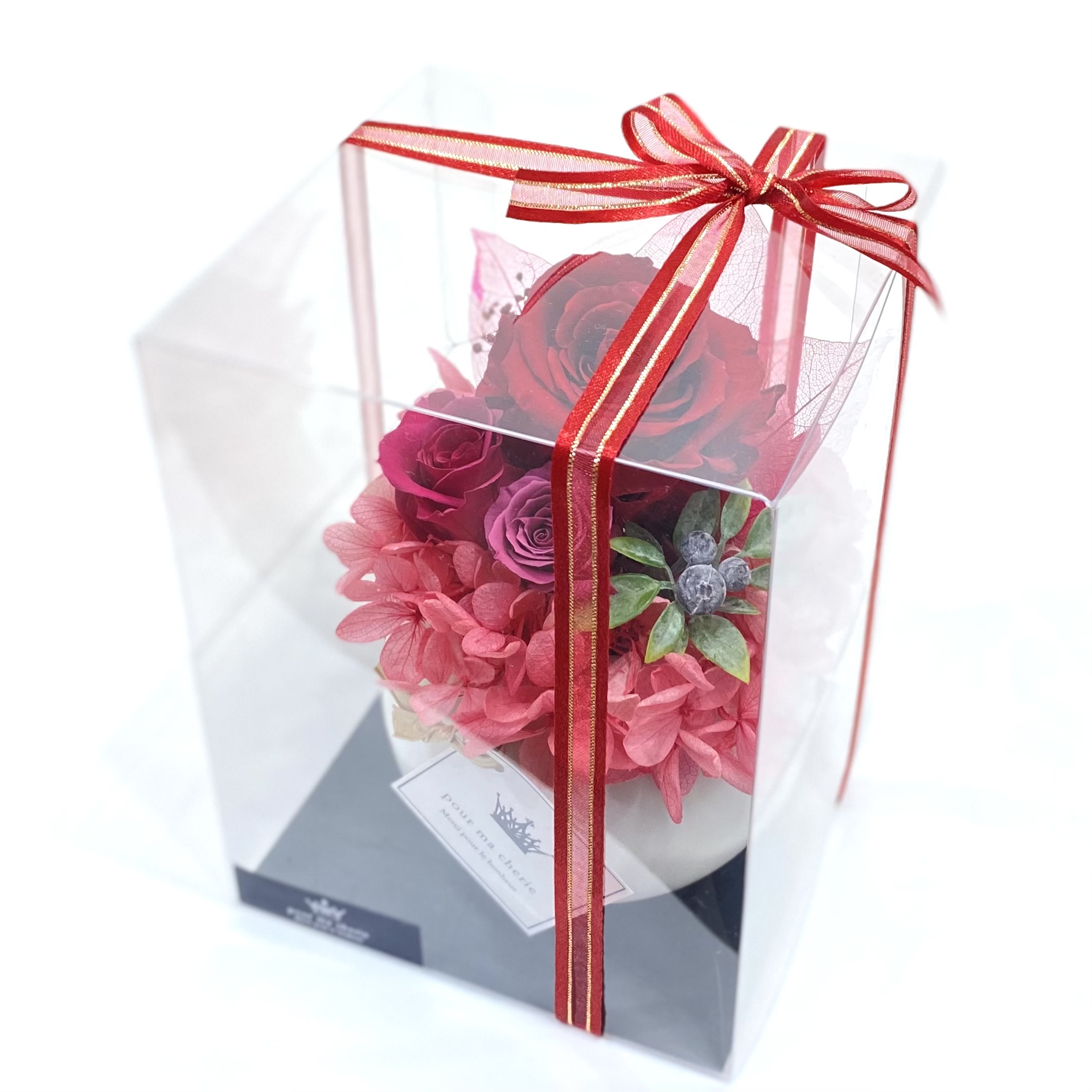 プリザーブドフラワーのバラを主体としたレッド系のプリザーブドフラワーです。ボリューム感もありおすすめです。また、どんなお部屋に飾っても映えるのでご自宅用にインテリアとしても長く楽しめますよ。是非、想いを込めたフラワーギフトにいかがですか!?※プリザーブドフラワーとは、生花に特殊加工を施した、長期間楽しめるお花です。【クリアケース時サイズ:高さ16cm×幅12cm×奥行12cm】