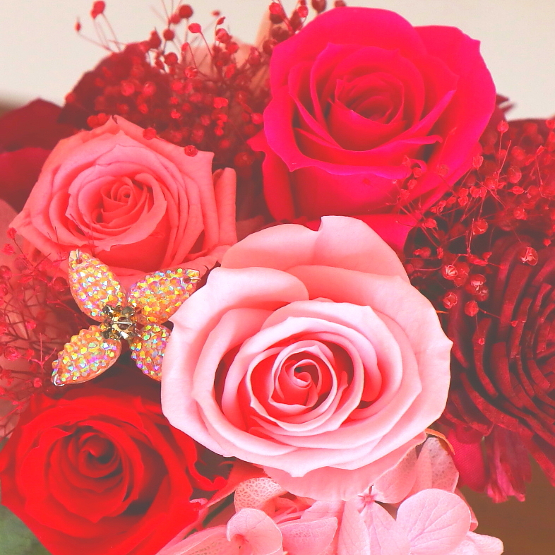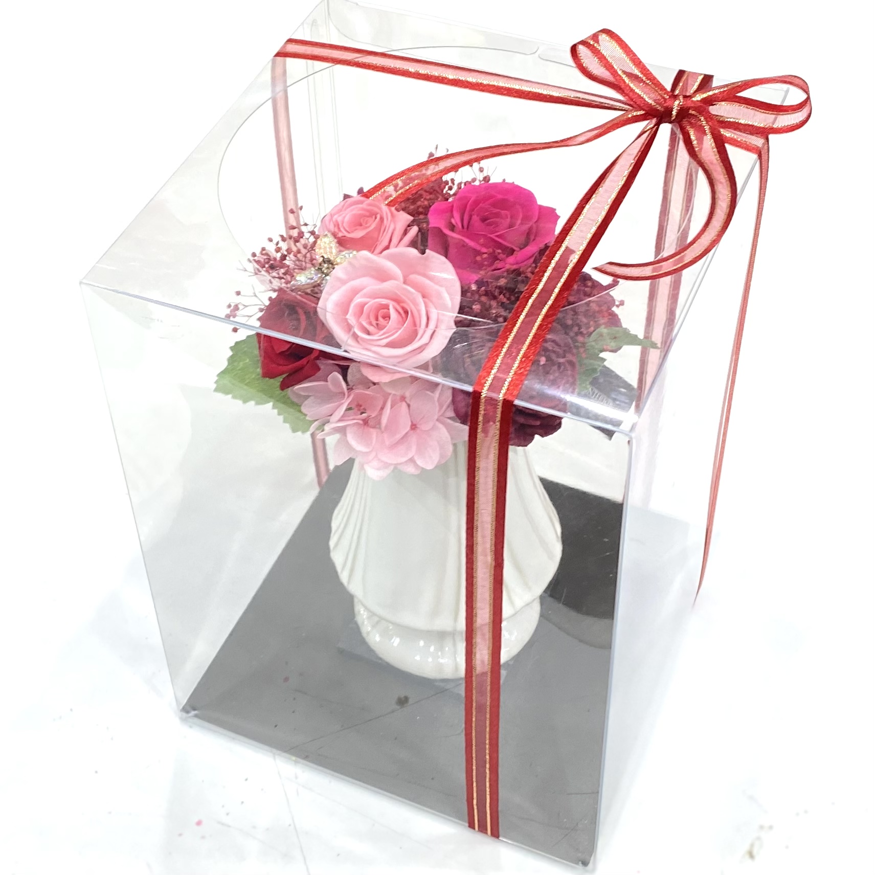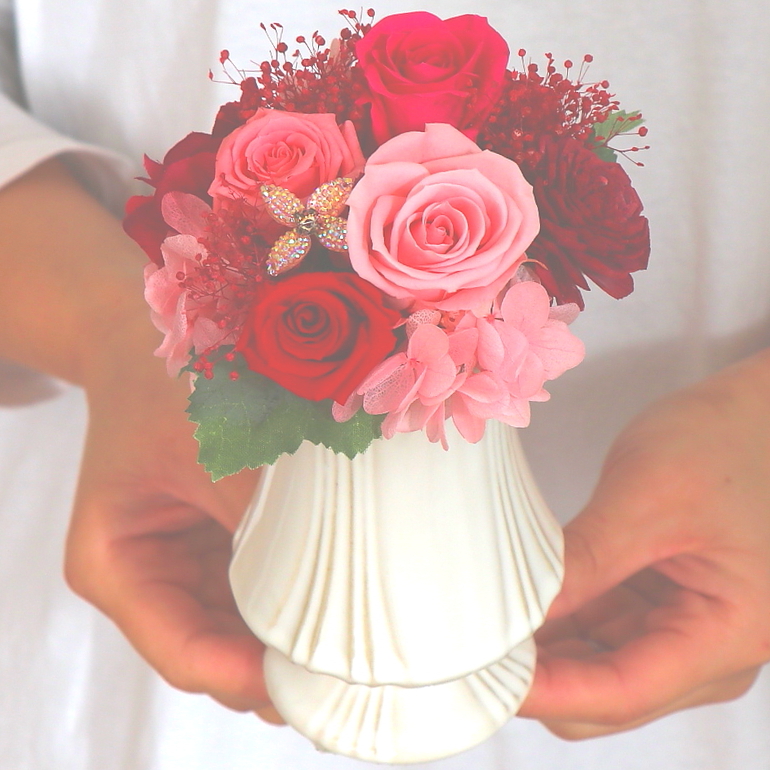 資材・ラッピング: ヨーロピアン花器(ホワイト)、モニメントピック類、リボン、ドライフォーム、ギフト用クリアケース付き、フラワーケアカード(取扱説明書)