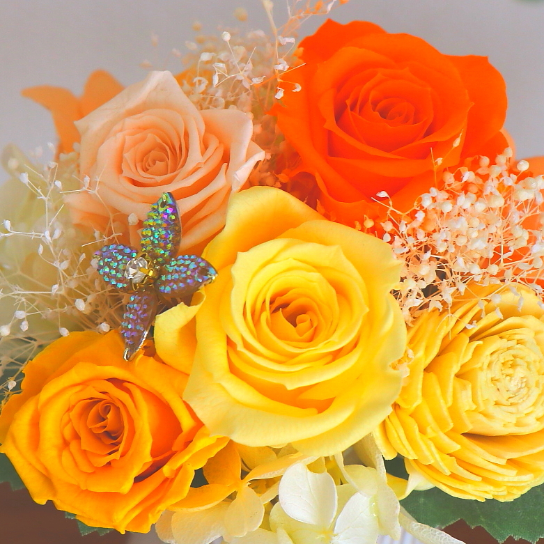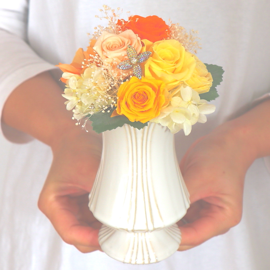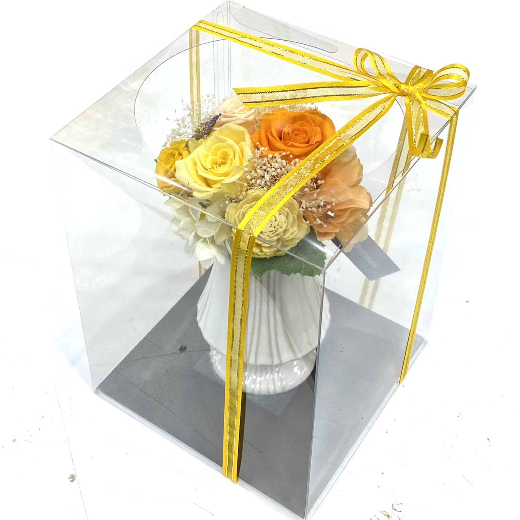 モダンのデザインが素敵な器にプリザーブドフラワーをアレンジ。黄色&オレンジ系の可愛らしい上品な雰囲気が室内のインテリアにピッタリですよ。【15時迄のご注文で翌日届きます】※こちらの商品についてのご相談、ご質問等ございましたら(メール)または(お電話)にて承ります。