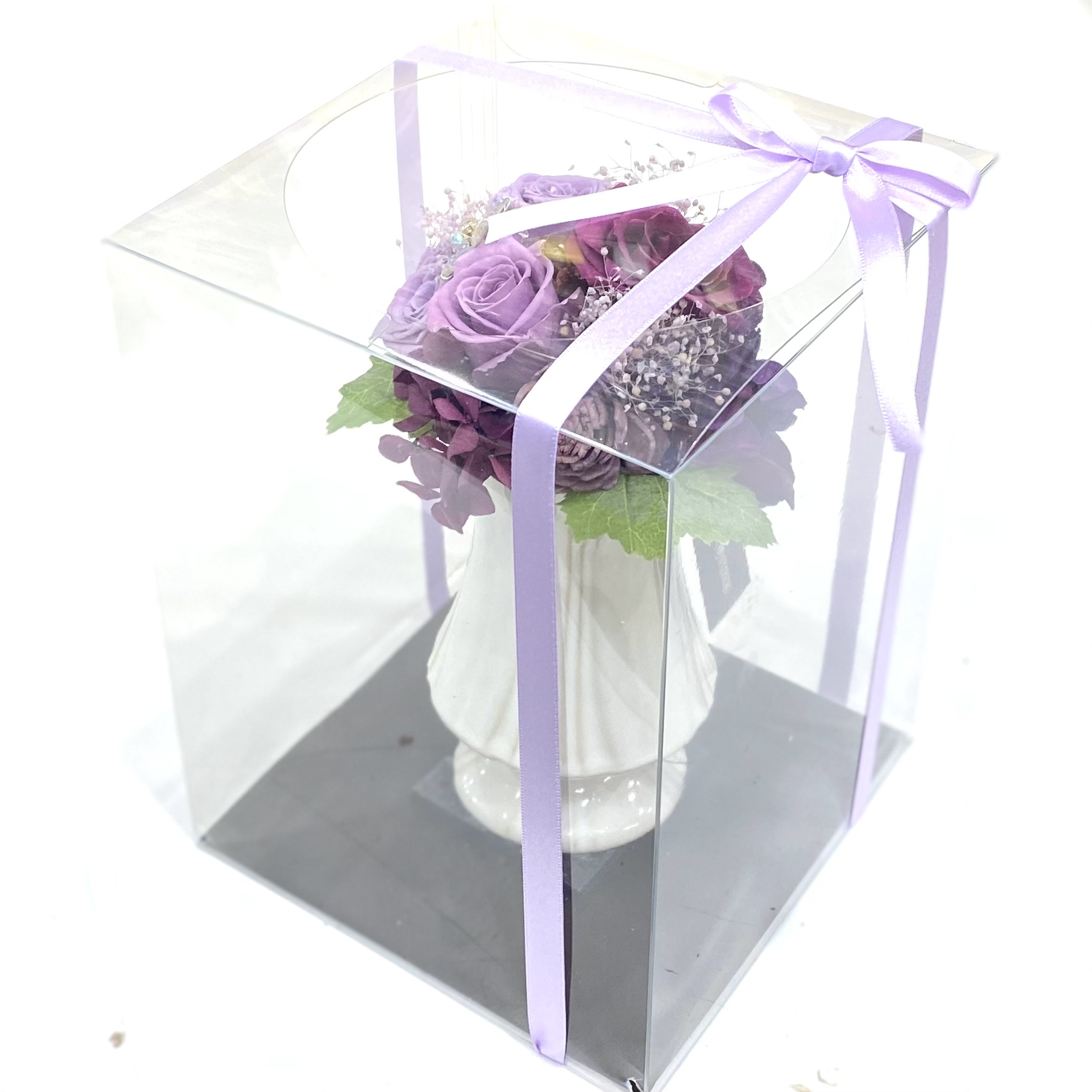 資材・ラッピング: ヨーロピアン花器(ホワイト)、モニメントピック類、リボン、ドライフォーム、ギフト用クリアケース付き、フラワーケアカード(取扱説明書)