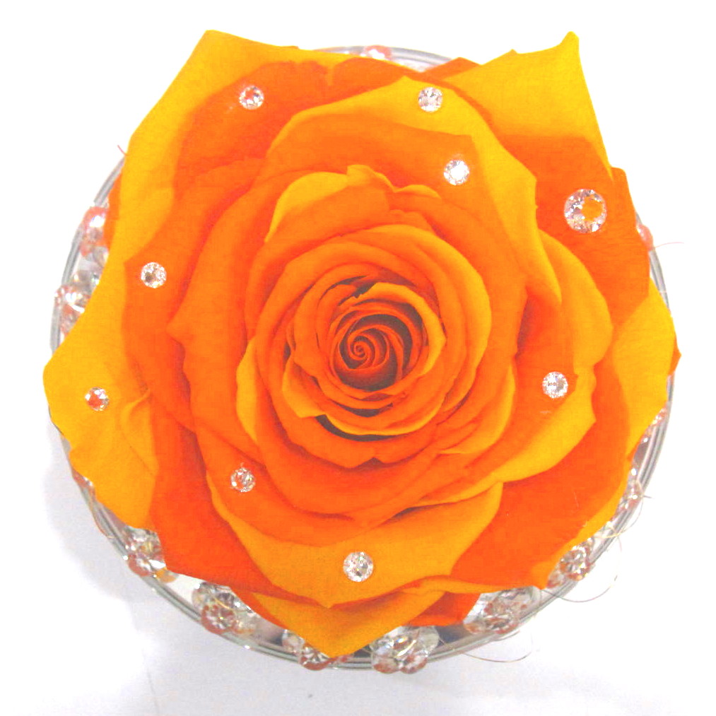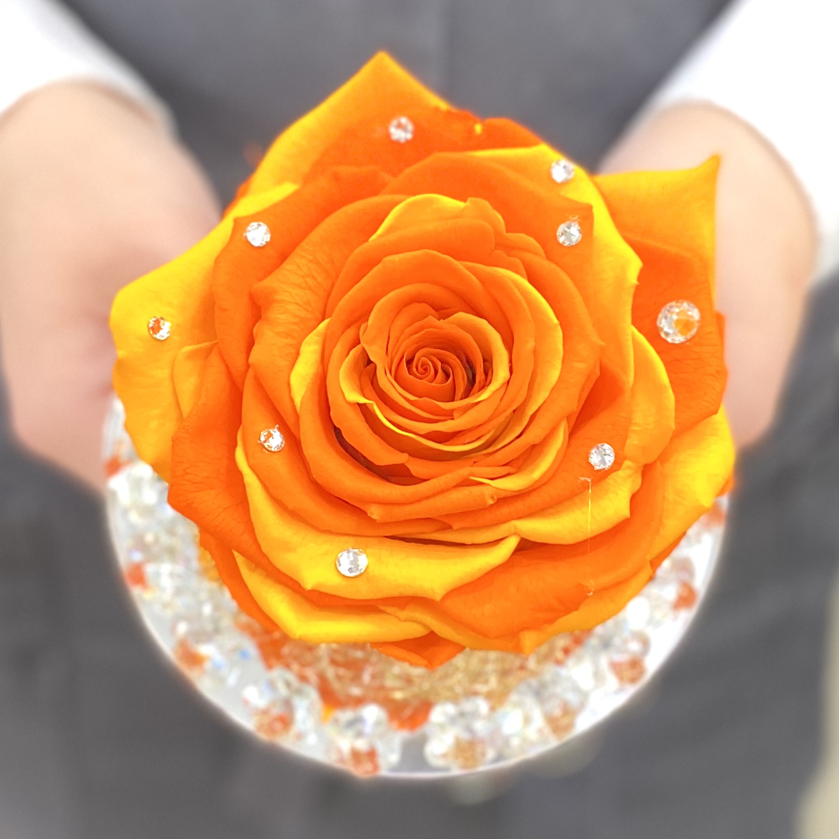 イエローローズとオレンジローズの花弁を1枚1枚丁寧に組み合わせて、1輪でも存在感のあるプリザーブドローズに仕上げました。花径約10cmの巨大輪のローズは、光輝くクリスタルプレートにアレンジし、スワロフスキーをバランスよく貼り付けました。とっても素敵できっと記憶に残る贈り物となりますよ。是非、想いを込めたフラワーギフトにいかがですか!?※プリザーブドフラワーとは、生花に特殊加工を施した、長期間楽しめるお花です。【クリアケース時サイズ:高さ20cm×幅15cm×奥行15cm】