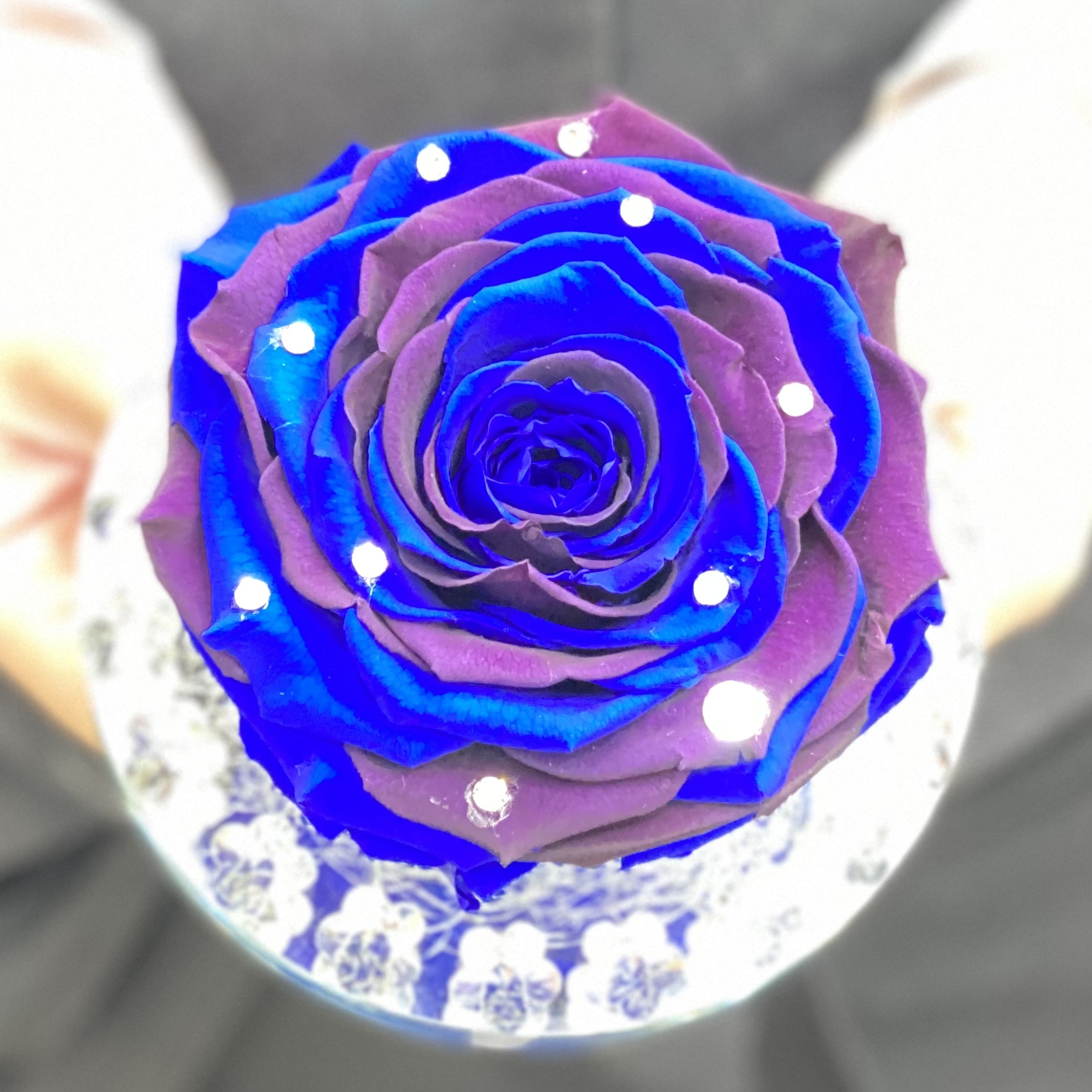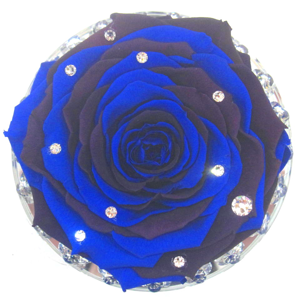 ブルーローズとディープブルーローズの花弁を1枚1枚丁寧に組み合わせて、1輪でも存在感のあるプリザーブドローズに仕上げました。花径約10cmの巨大輪のローズは、光輝くクリスタルプレートにアレンジし、スワロフスキーをバランスよく貼り付けました。とっても素敵できっと記憶に残る贈り物となりますよ。是非、想いを込めたフラワーギフトにいかがですか!?※プリザーブドフラワーとは、生花に特殊加工を施した、長期間楽しめるお花です。【クリアケース時サイズ:高さ20cm×幅15cm×奥行15cm】