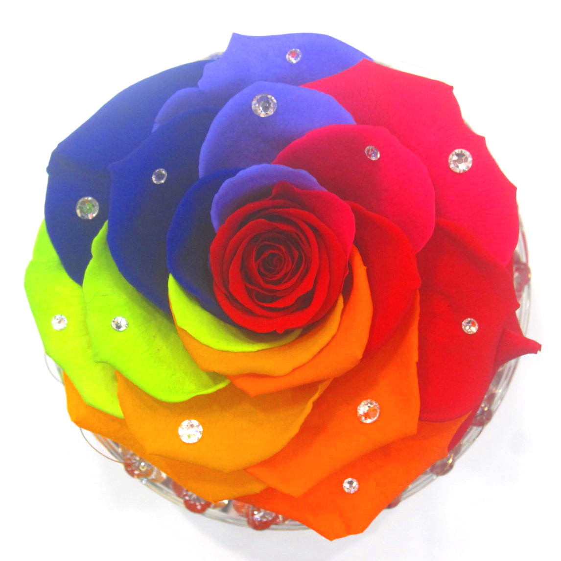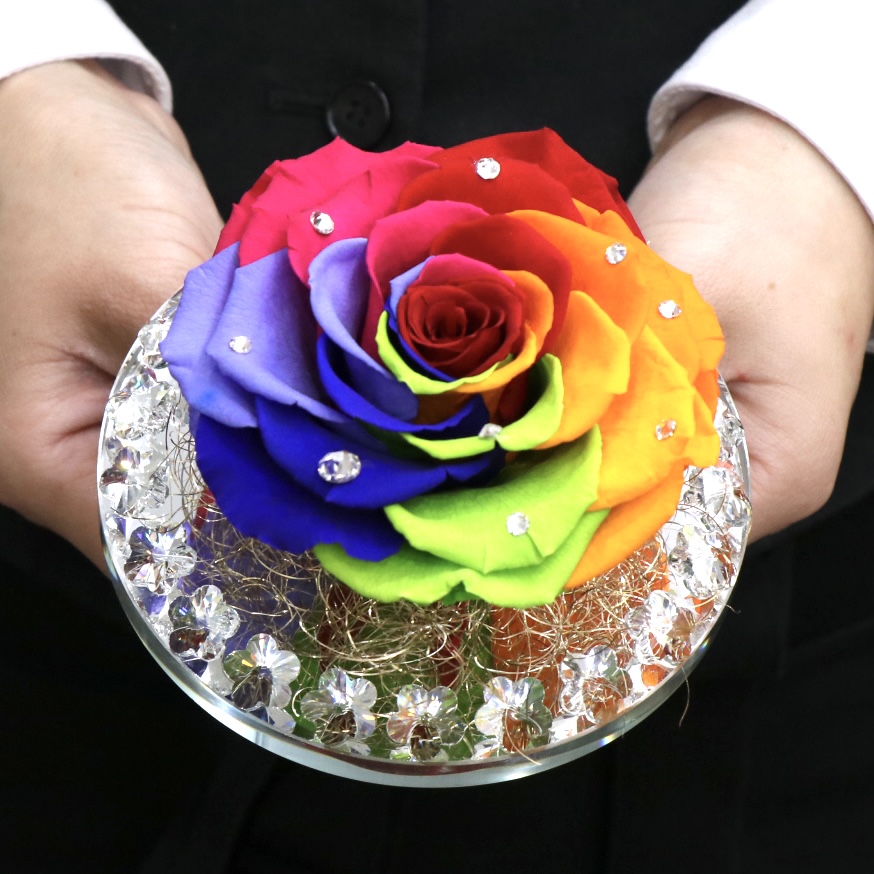 クリスタルプレートに巨大輪のレインボーローズを素敵にアレンジしたプリザーブドフラワー。幸運を呼ぶ輝く七色の薔薇。ギフト専用クリアケースに入れて綺麗にラッピング致します。いつもとは違う特別な贈り物におすすめです。【15時迄のご注文で翌日届きます】※こちらの商品についてのご相談、ご質問等ございましたら(メール)または(お電話)にて承ります。