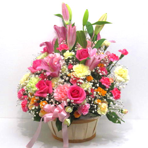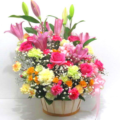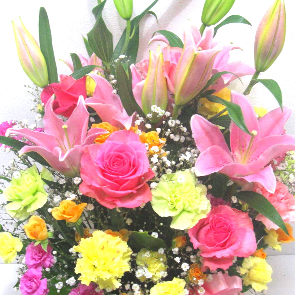 花材: メイン ユリ、バラ、カーネーション、かすみ草など その他 葉物類など