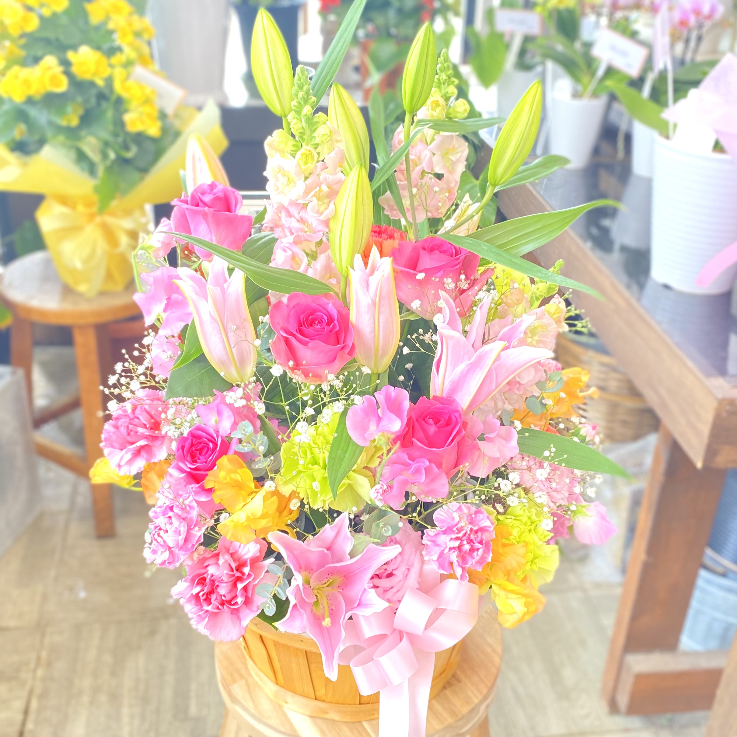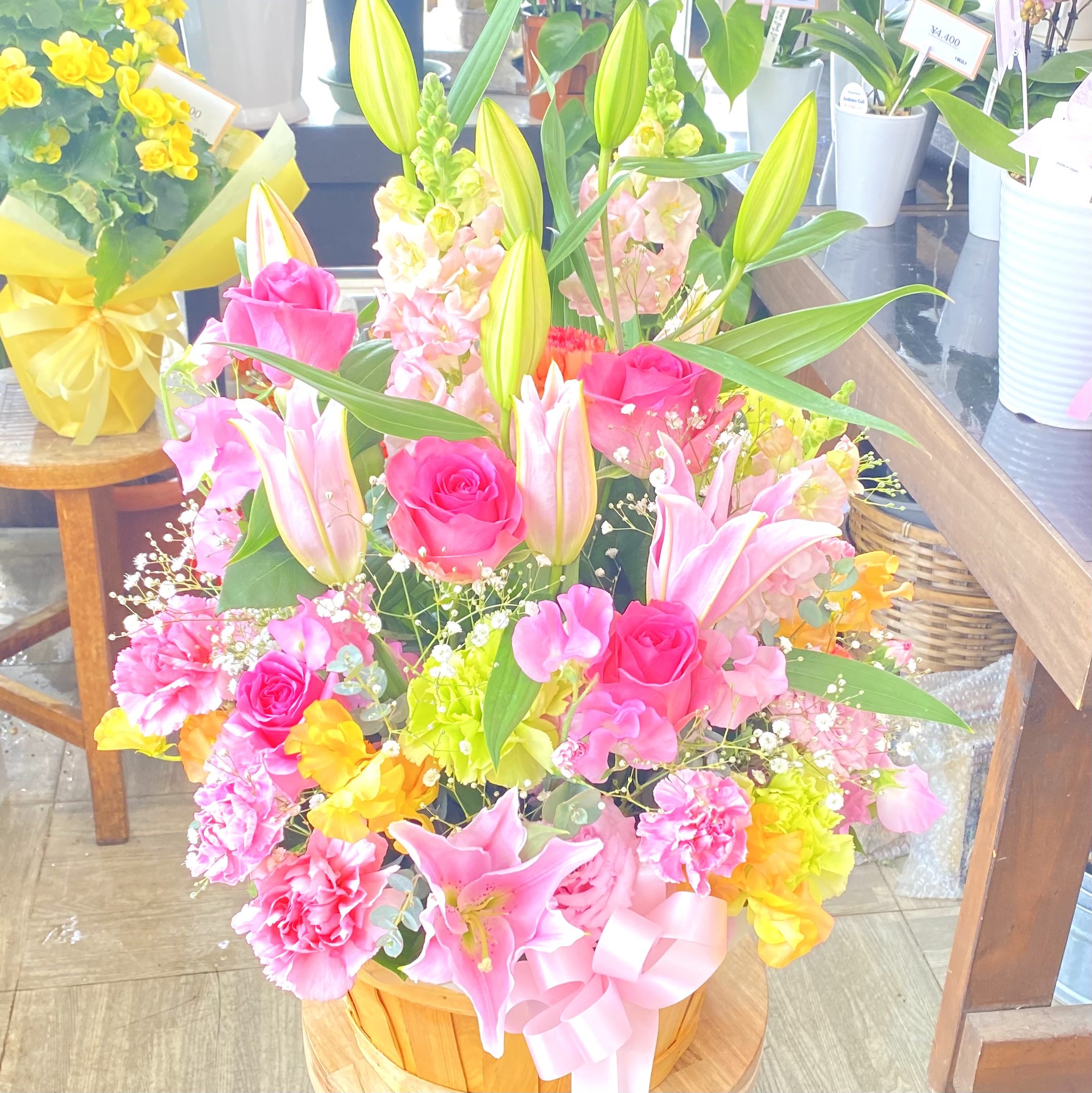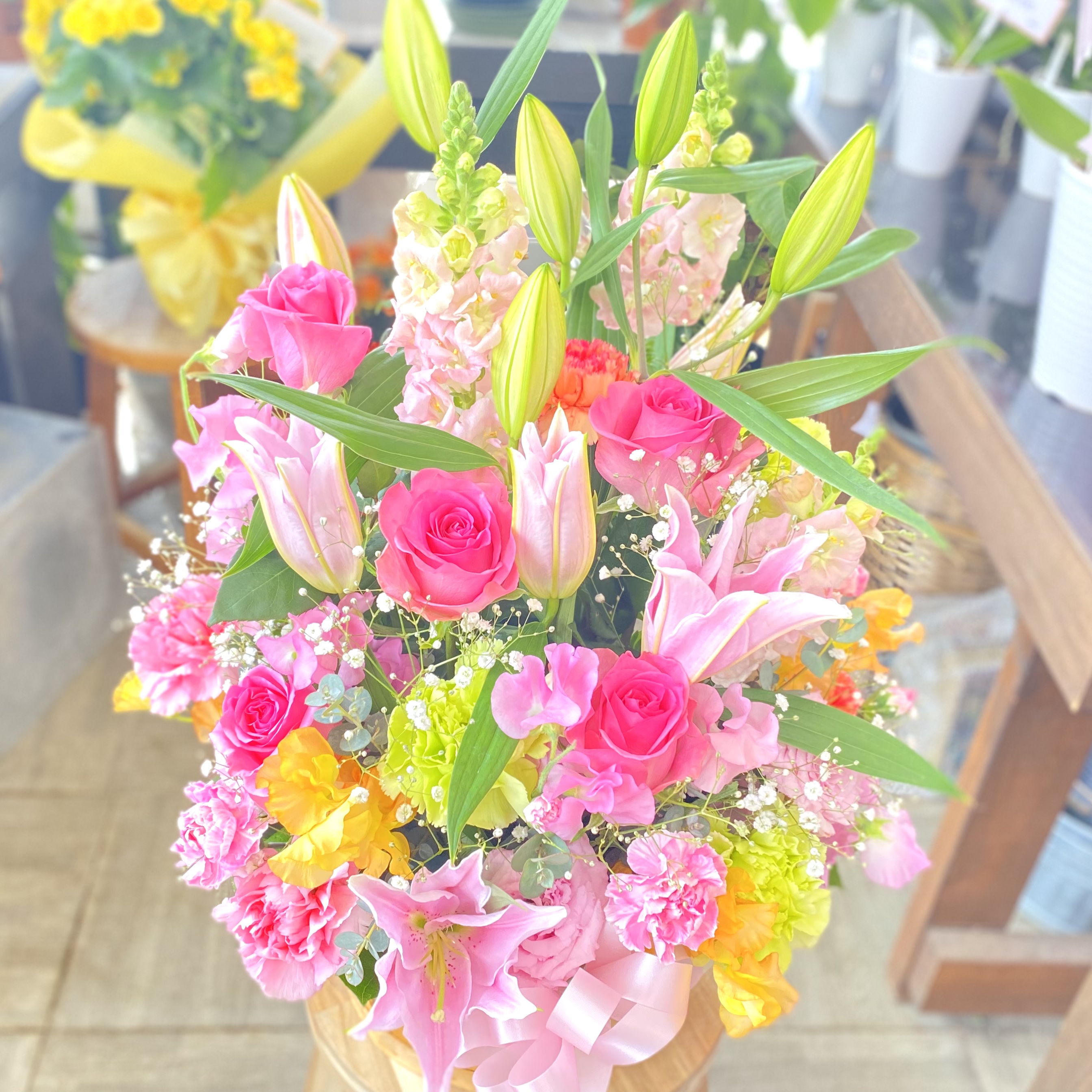 花材: メイン ユリ、バラ、カーネーション、かすみ草など その他 季節のお花、葉物類など