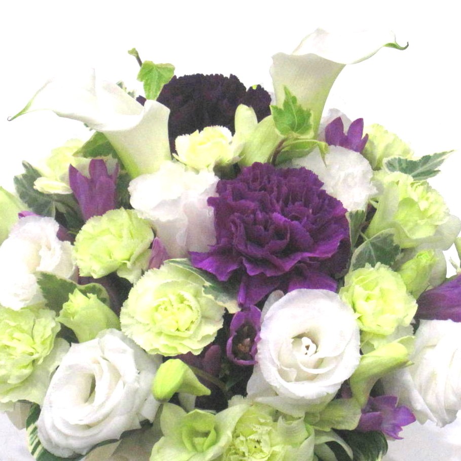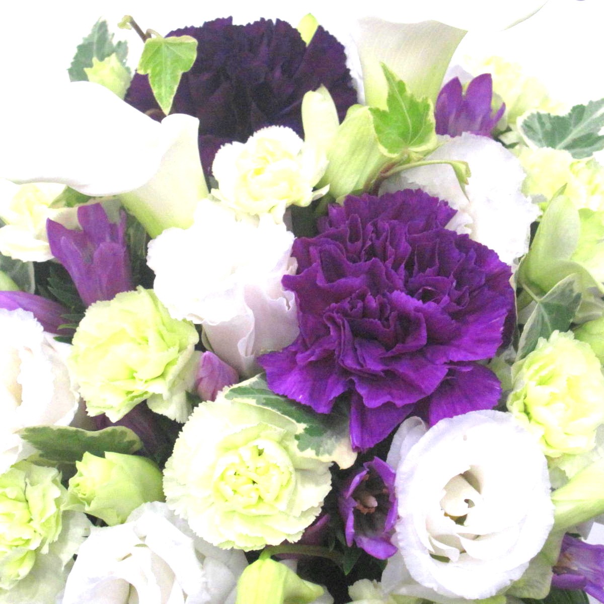 秋の白&紫系の上品なアレンジメント。天国に旅立ち、見守ってくれている故人への贈り物におすすめです。【15時迄のご注文で翌日届きます】※こちらの商品についてのご相談、ご質問等ございましたら(メール)または(お電話)にて承ります。