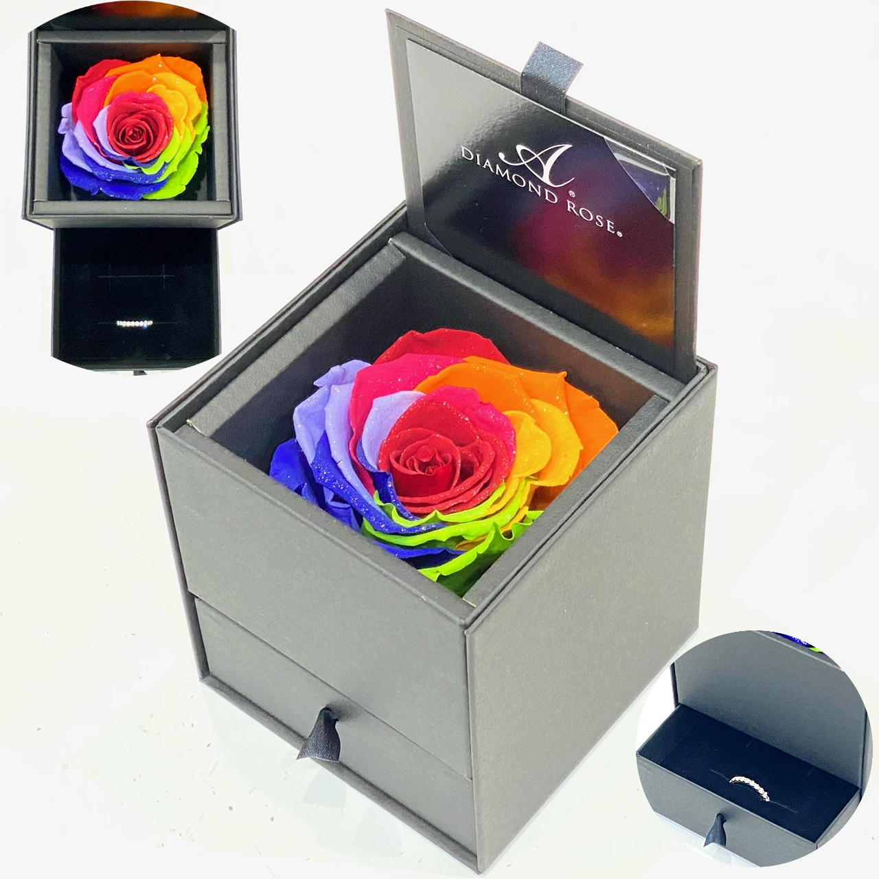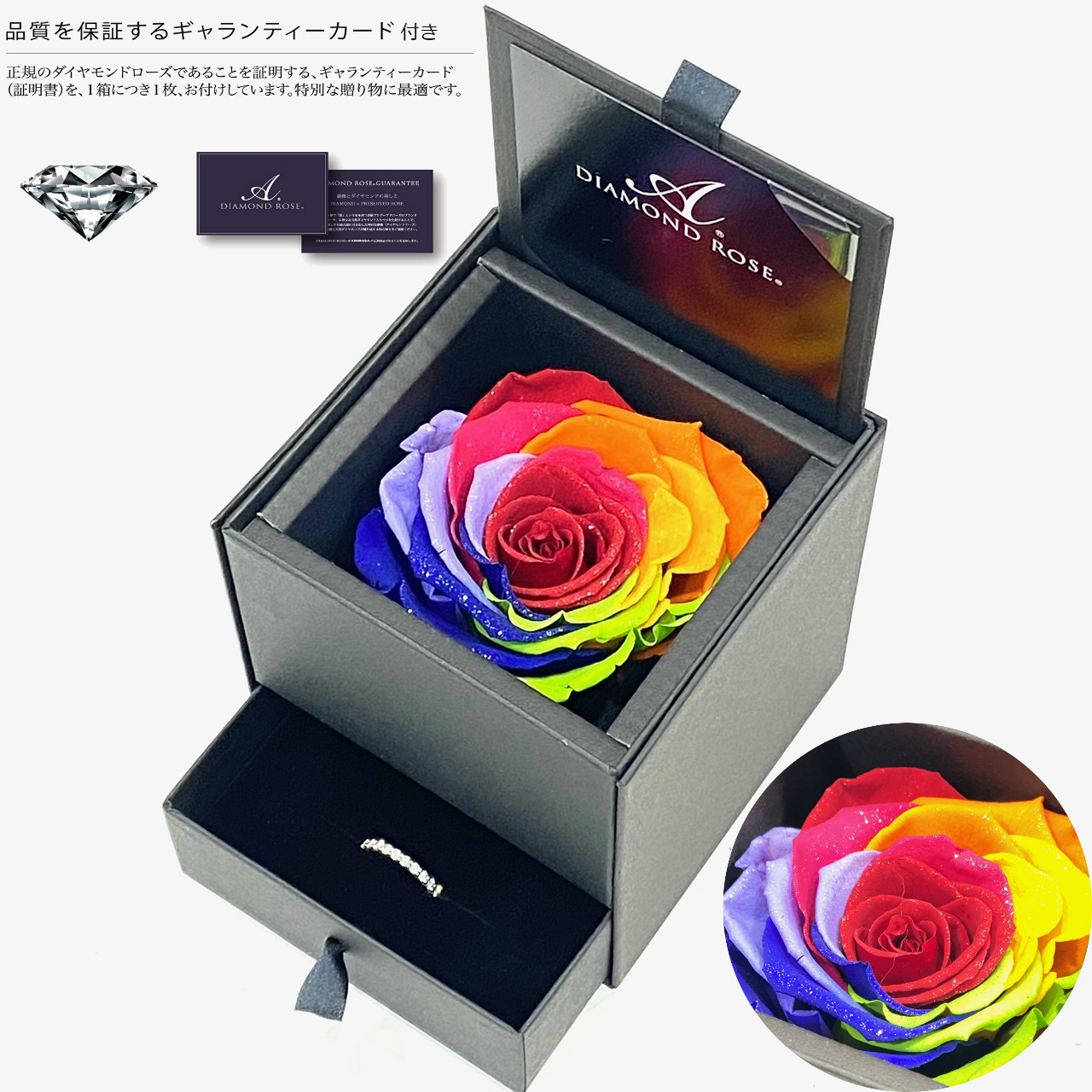 プリザーブドローズのいろんな色の花弁を一枚一枚丁寧に貼り付けてレインボーローズを制作。希少な天然ダイアモンド入りラメを花びらにちりばめた「ダイアモンドローズ」をモダンなボックスにアレンジした大人気の贈り物です。今回はリングケース付きなのでジュエリーなども美しく収納できます。是非、想いを込めたフラワーギフトにいかがですか!?※プリザーブドフラワーとは、生花に特殊加工を施した、長期間楽しめるお花です。【ボックスを閉じたサイズ:高さ約10cm×幅約9cm×奥行約9cm】