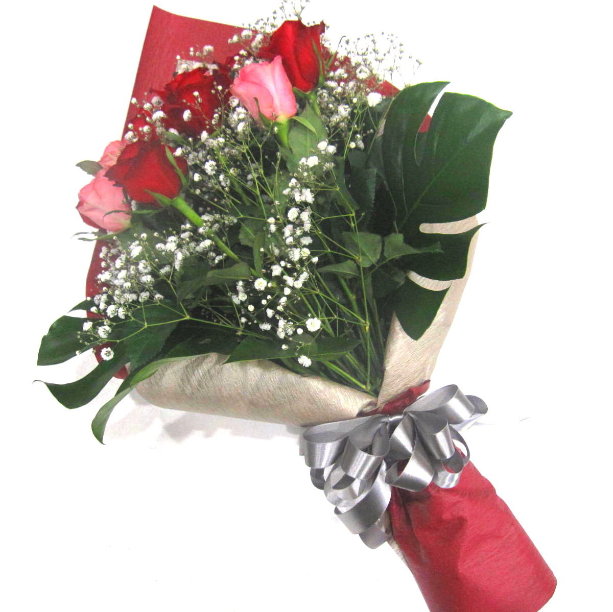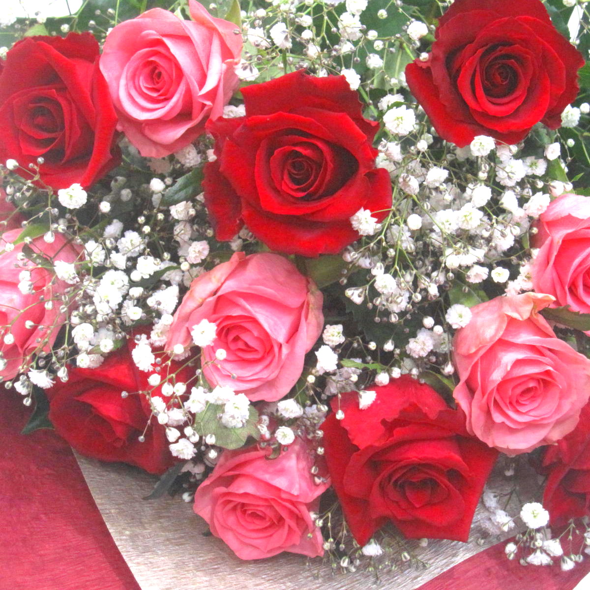 赤いバラ6本とピンクバラ6本、合計12本とかすみ草を入れたお洒落でカッコイイ花束。特別な贈り物にいかがですか。【15時迄のご注文で翌日届きます】※こちらの商品についてのご相談、ご質問等ございましたら(メール)または(お電話)にて承ります。