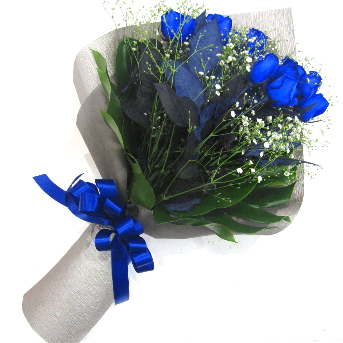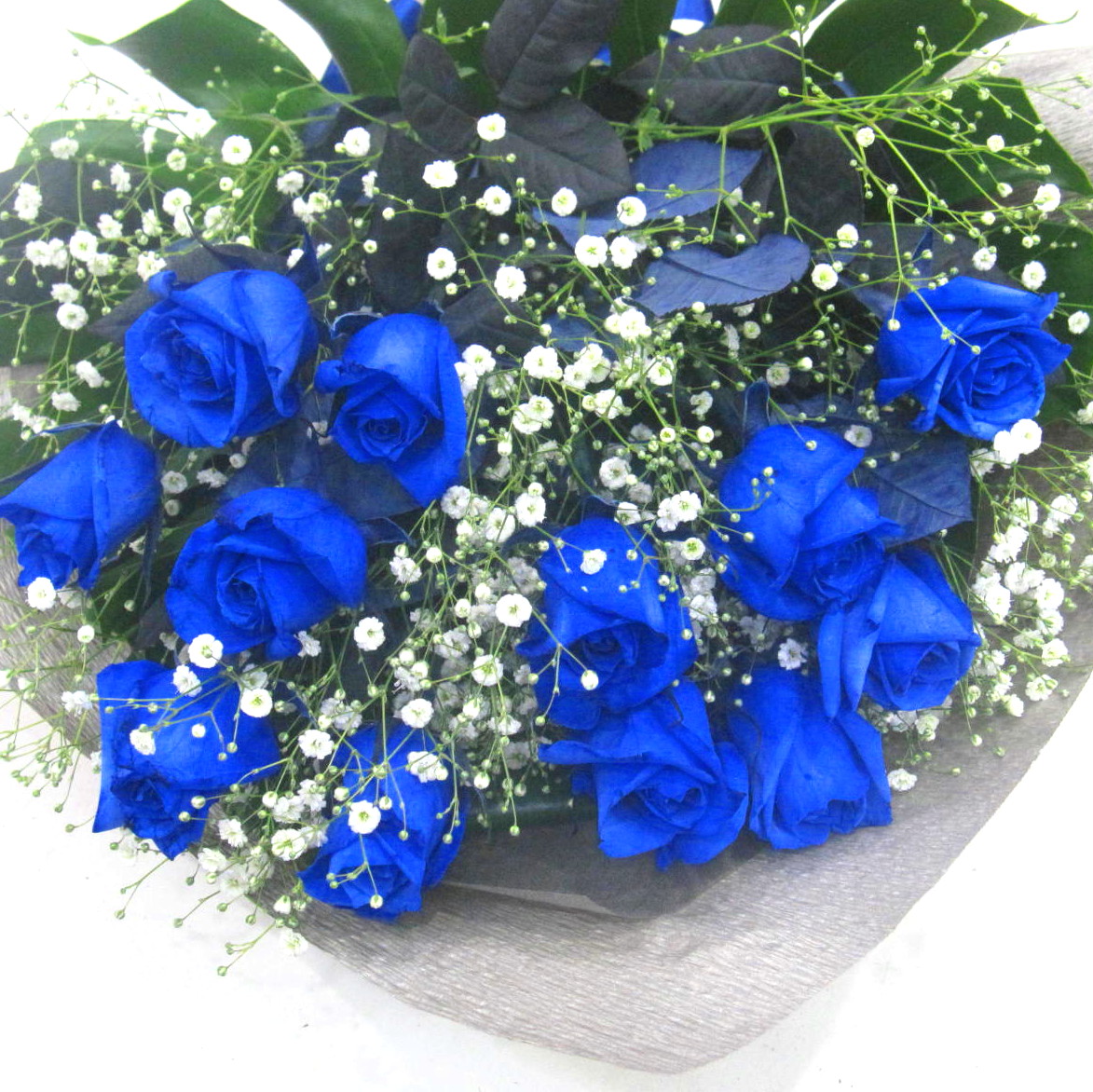 オリジナルで染色加工した青いバラを12本とかすみ草を入れたお洒落でカッコイイ花束。特別な贈り物にいかがですか。【15時迄のご注文で翌日届きます】※こちらの商品についてのご相談、ご質問等ございましたら(メール)または(お電話)にて承ります。