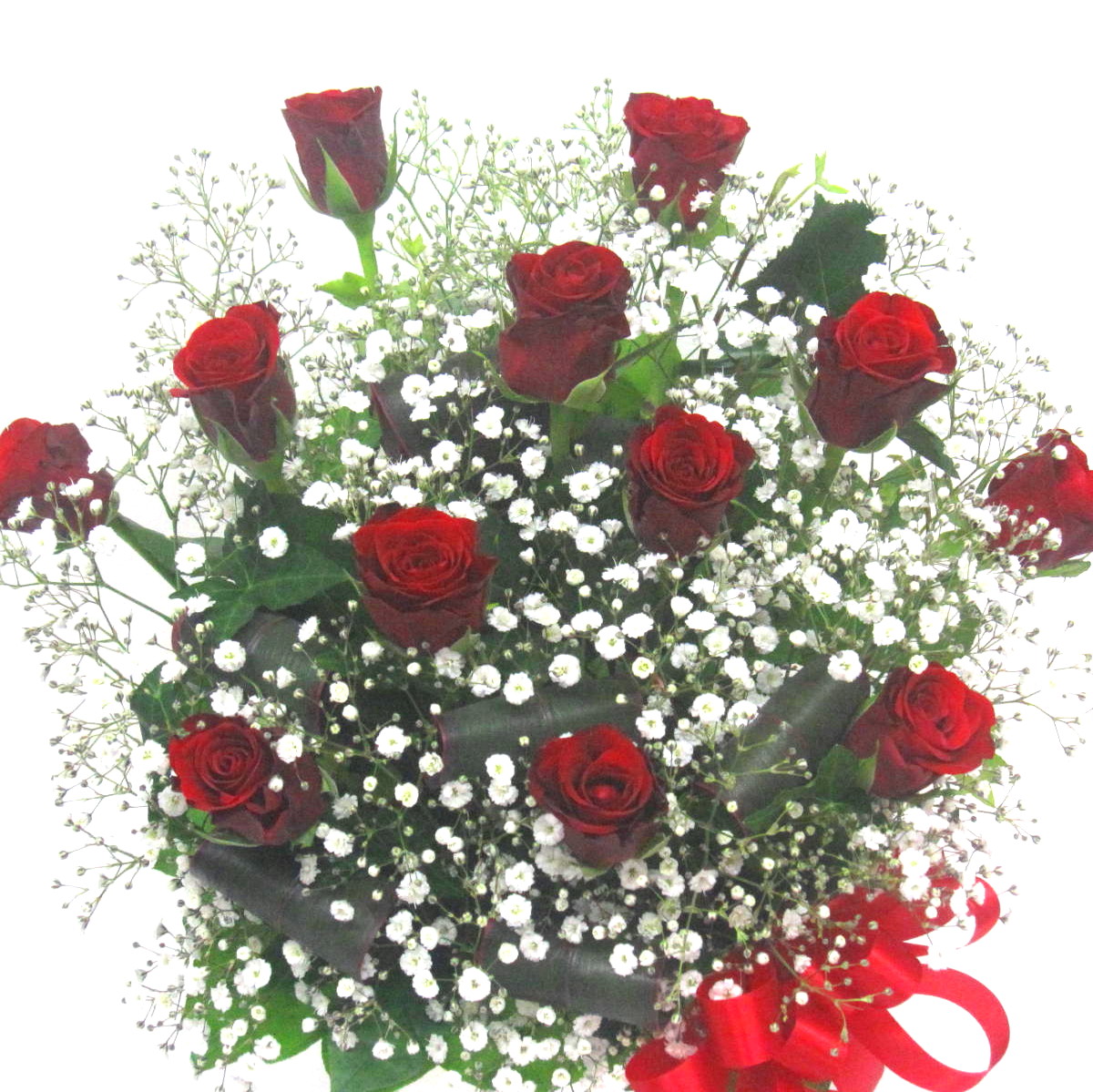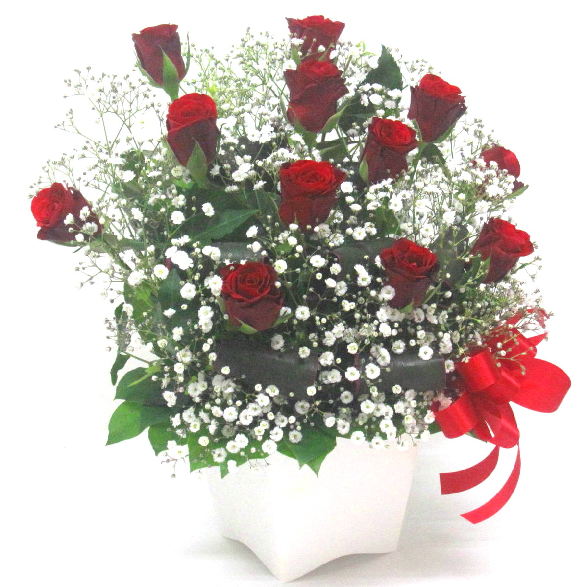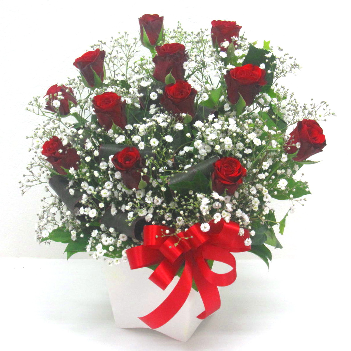 赤いバラを12本とかすみ草を入れた華やかなアレンジメント。特別な贈り物にいかがですか。【15時迄のご注文で翌日届きます】※こちらの商品についてのご相談、ご質問等ございましたら(メール)または(お電話)にて承ります。