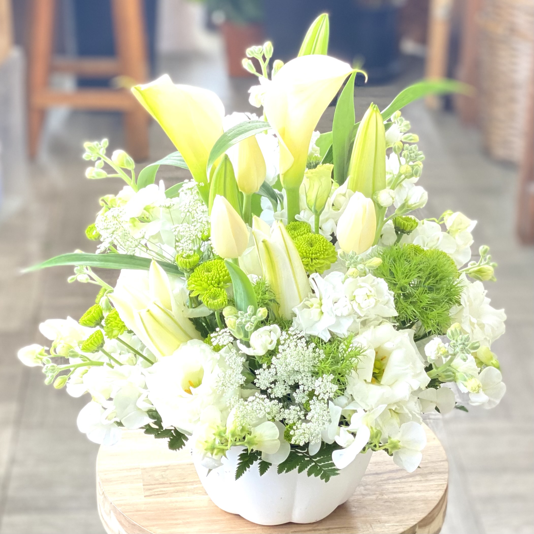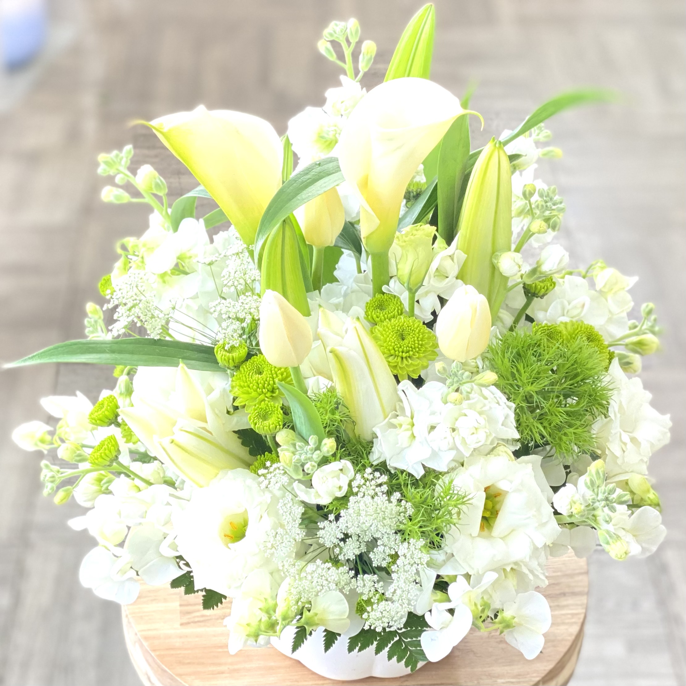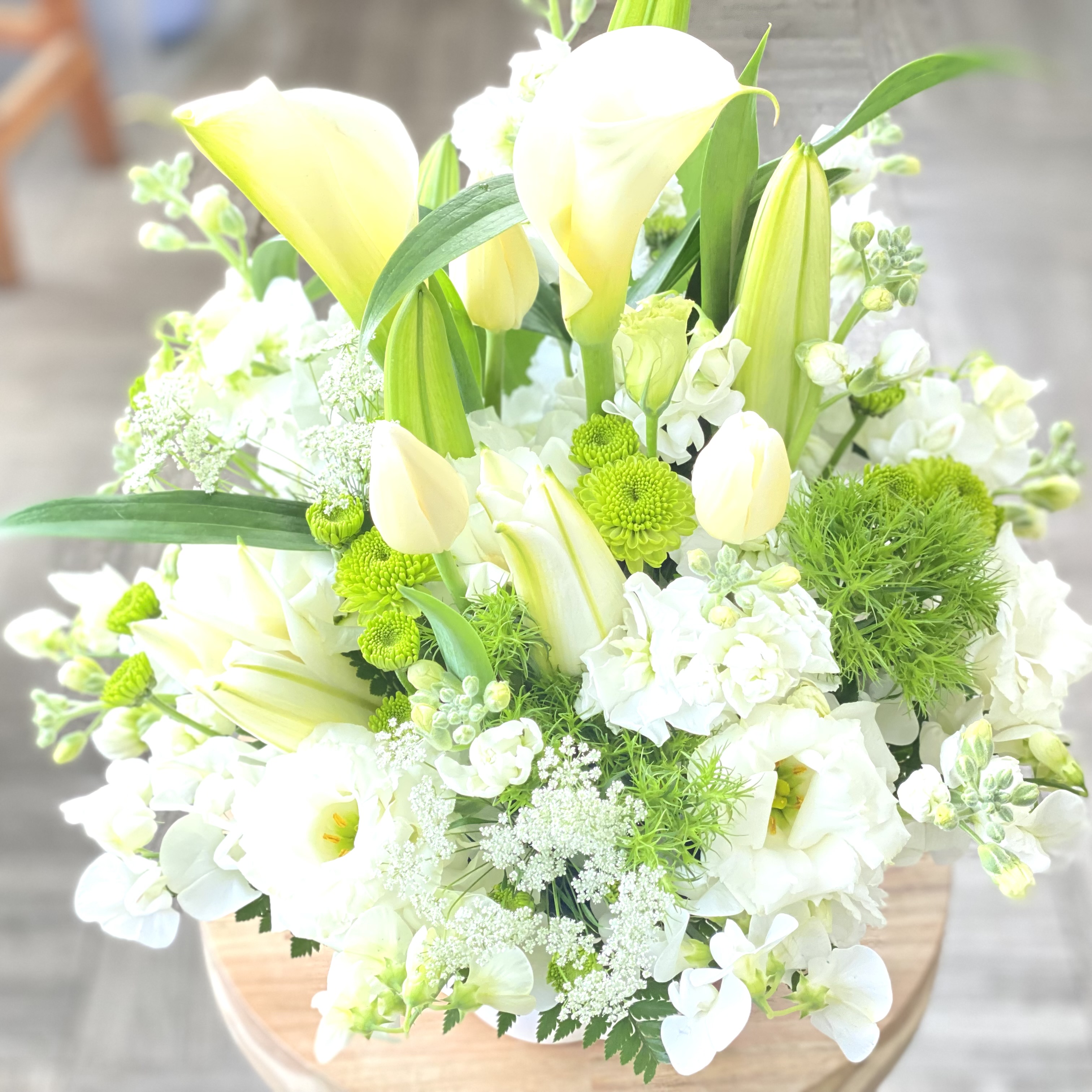 花材: メイン ユリ、カラー、チューリップ、スイートピー、ホワイトレースフラワー、トルコギキョウ、SPストックなど その他 葉物類など ※花材の入荷状況によってはメイン花材が変わる可能性がございますが、色合いや雰囲気に注意して制作致します。ご安心ください。