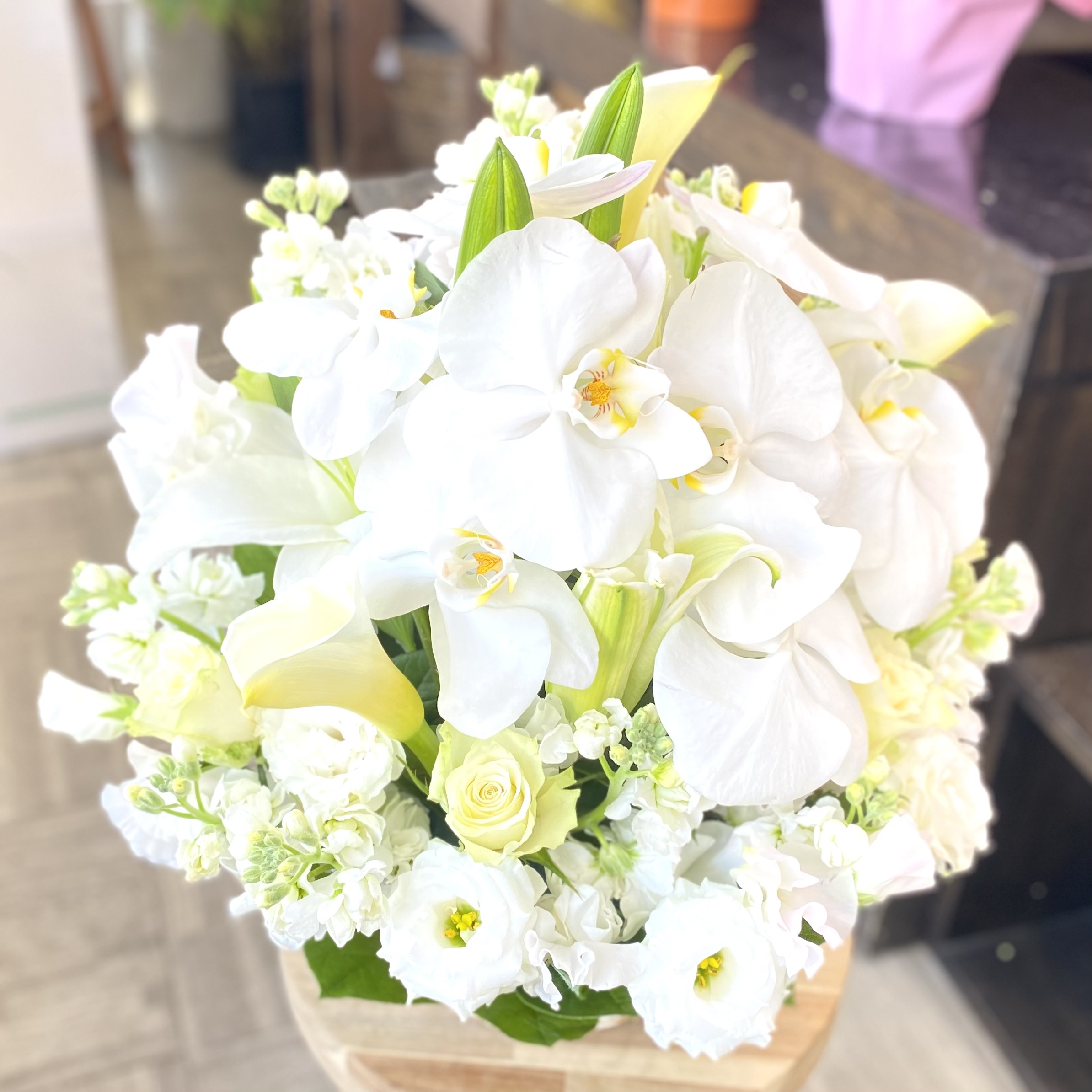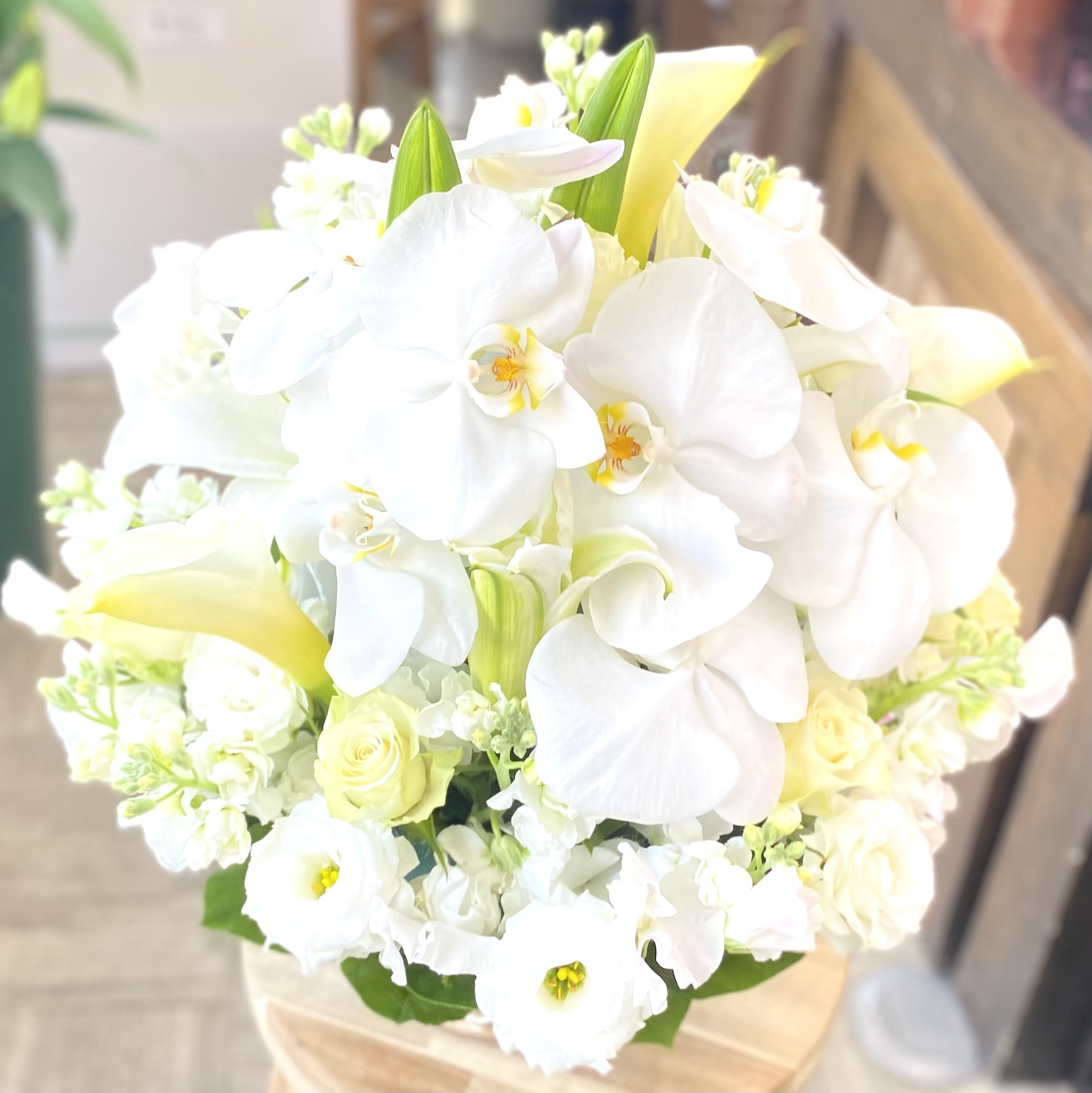 花材: メイン 胡蝶蘭、ユリ、バラ、トルコギキョウ、SPストック、スイートピーなど その他 葉物類など ※花材の入荷状況によってはメイン花材が変わる可能性がございますが、色合いや雰囲気に注意して制作致します。ご安心ください。