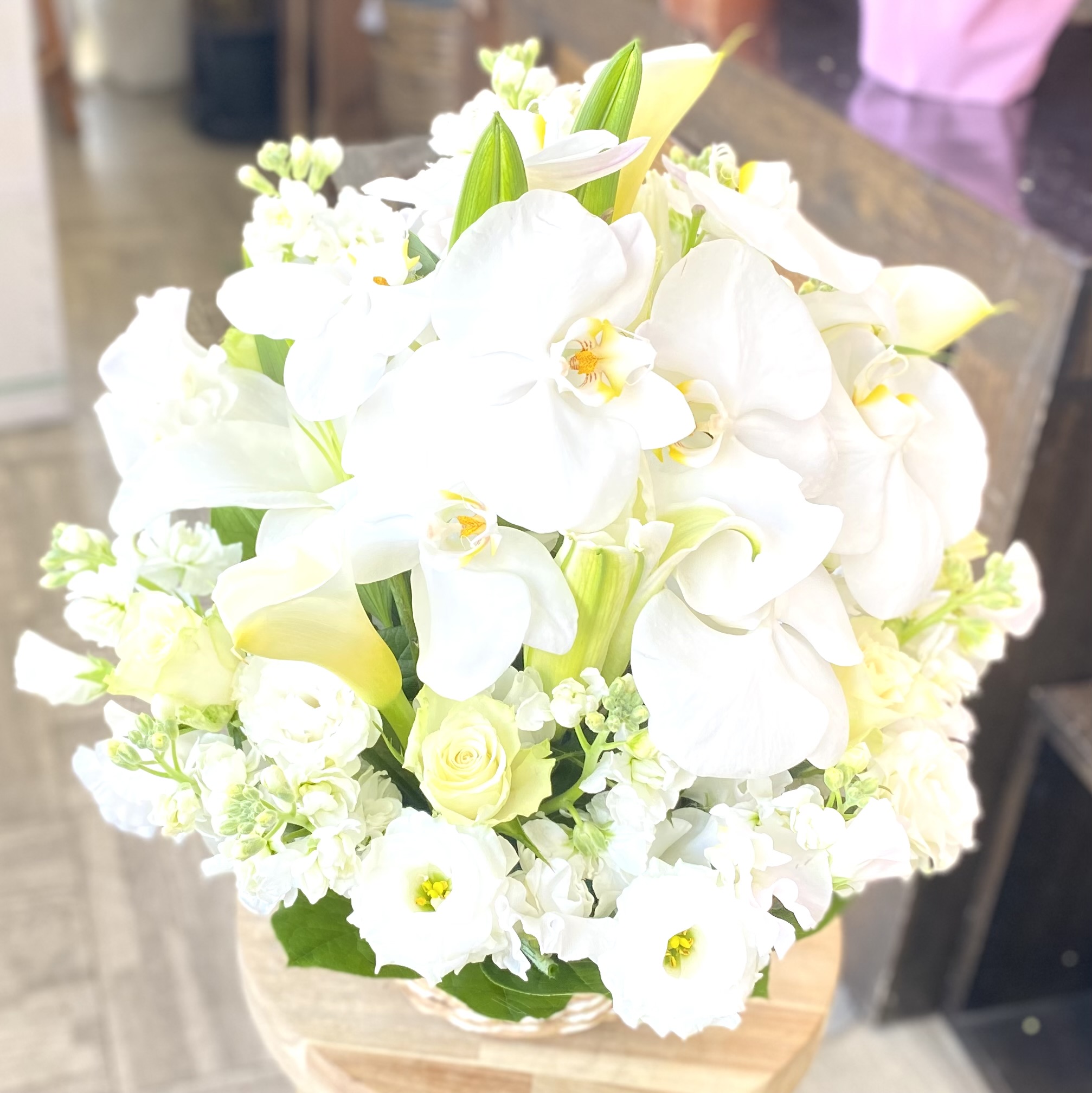 大切な方を偲ぶ白上がりの御供え用アレンジメントです。スイートピーなど春のお花を入れてアクセントにコチョウランなどと合わせて上品にお作りします。また、その日、市場から入荷した鮮度の良いお花でお作りしますので花持ちが良く、ご利用いただいたお客様から「大変花持ちが良い」と高い評価をいただいております。目を閉じて心の中にいる故人への想いをそっと呼び起こします。当店では、お客様のその想いをしっかりと受け止め、心を込めて制作致します。静岡県から全国へお届けします。春の故人を偲ぶ色々なシーンで是非、ご利用下さい。