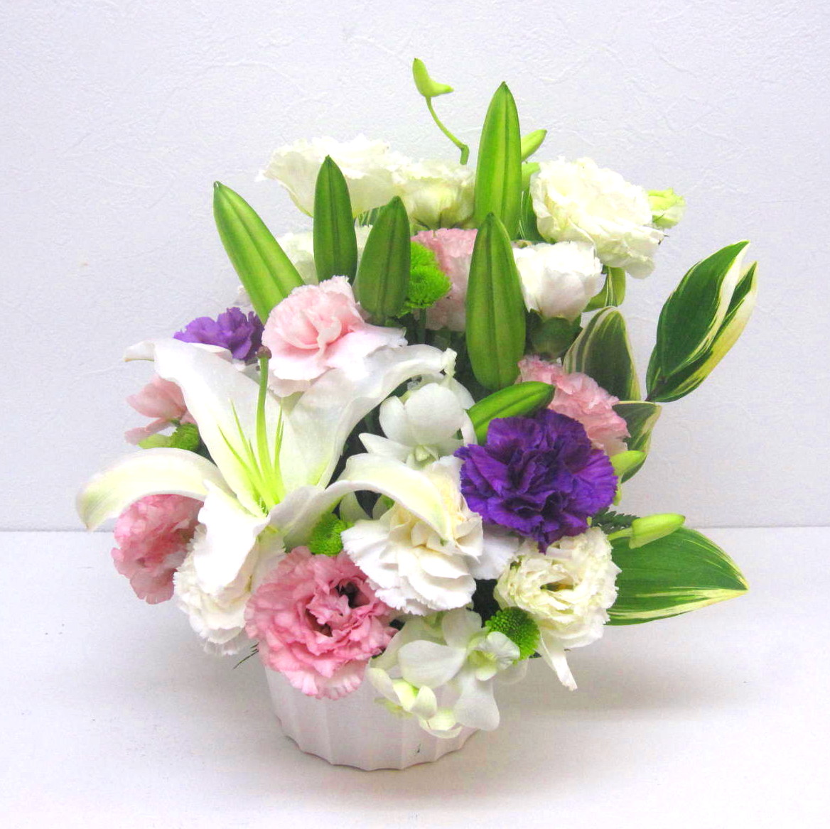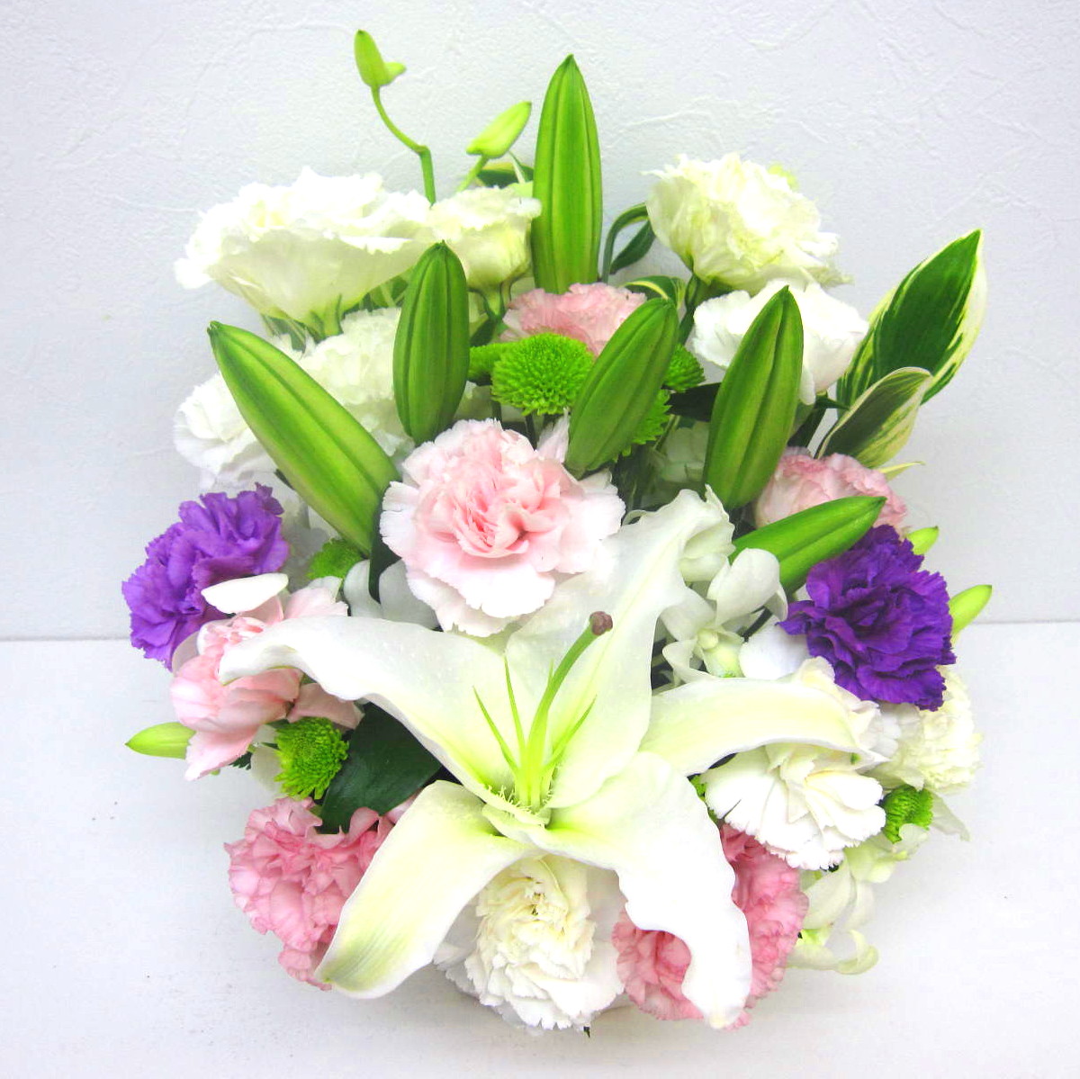 あの人を偲んで…。少し明るい御供え用アレンジです。ユリを入れて洋花で上品にお作りします。また、その日、市場から入荷した鮮度の良いお花でお作りしますので花持ちが良く、ご利用いただいたお客様から「大変花持ちが良い」と高い評価をいただいております。目を閉じて心の中にいる故人への想いをそっと呼び起こします。当店では、お客様のその想いをしっかりと受け止め、心を込めて制作致します。静岡県から全国へお届けします。故人を偲ぶ色々なシーンで是非、ご利用下さい。