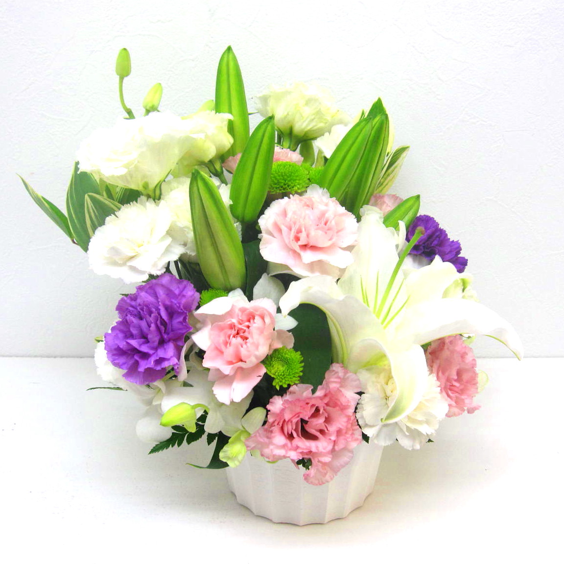 花材: メイン ユリ、トルコギキョウ、カーネーション、デンファレ、スプレーマムなど その他 葉物類など ※花材の入荷状況によってはメイン花材が変わる可能性がございますが、色合いや雰囲気に注意して制作致します。ご安心ください。