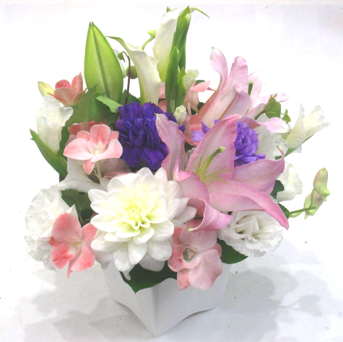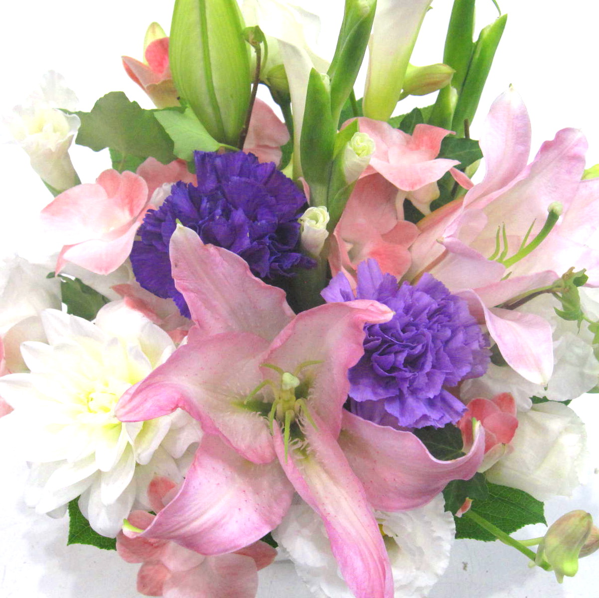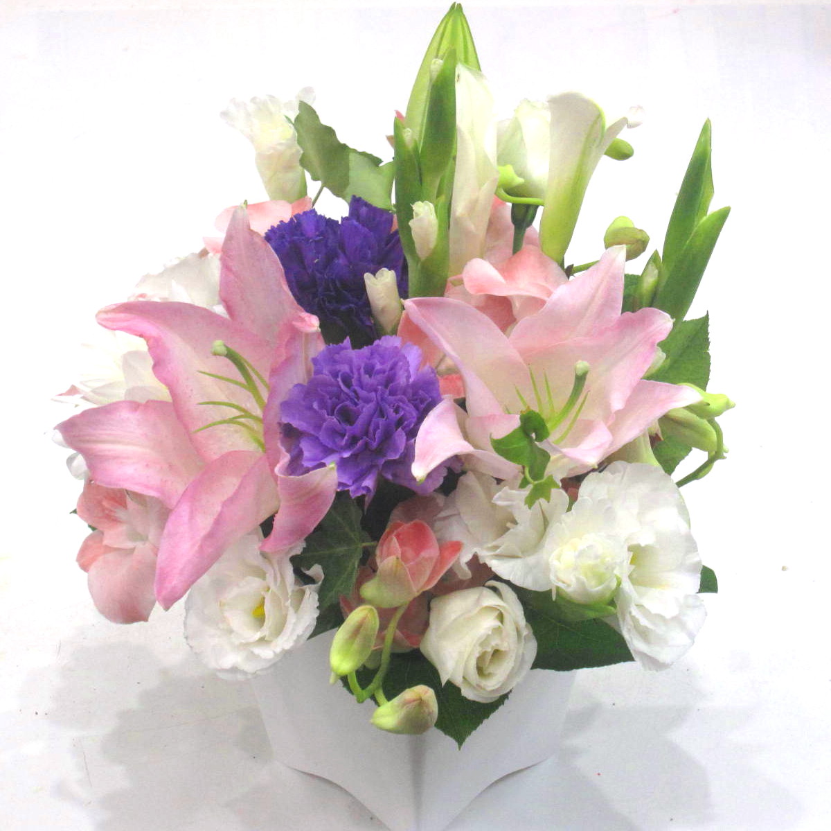 ピンクのユリを入れたボリュームのある可愛らしい色合いのアレンジメント。明くて可愛い雰囲気の故人を思い出し偲びます。【15時迄のご注文で翌日届きます】※こちらの商品についてのご相談、ご質問等ございましたら(メール)または(お電話)にて承ります。