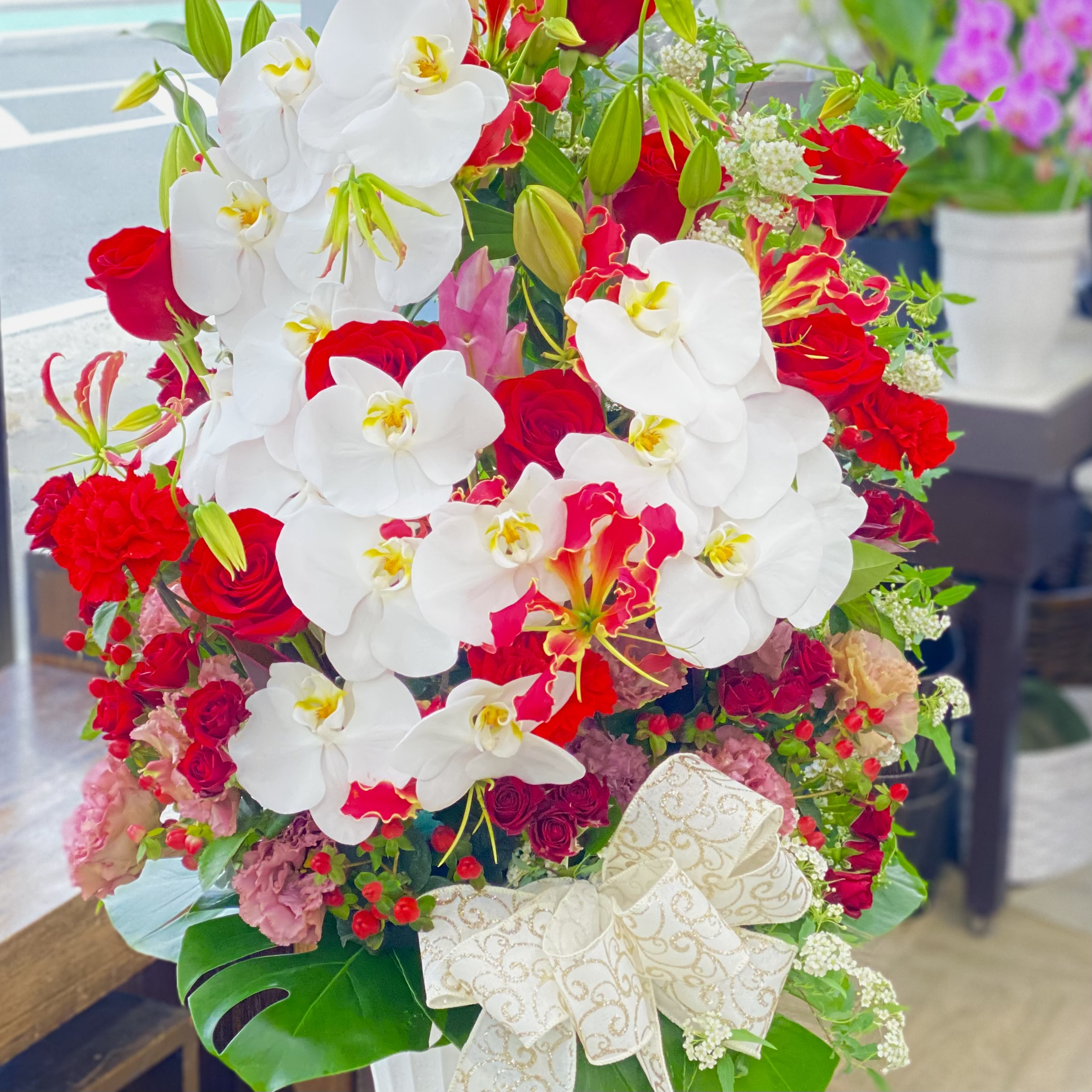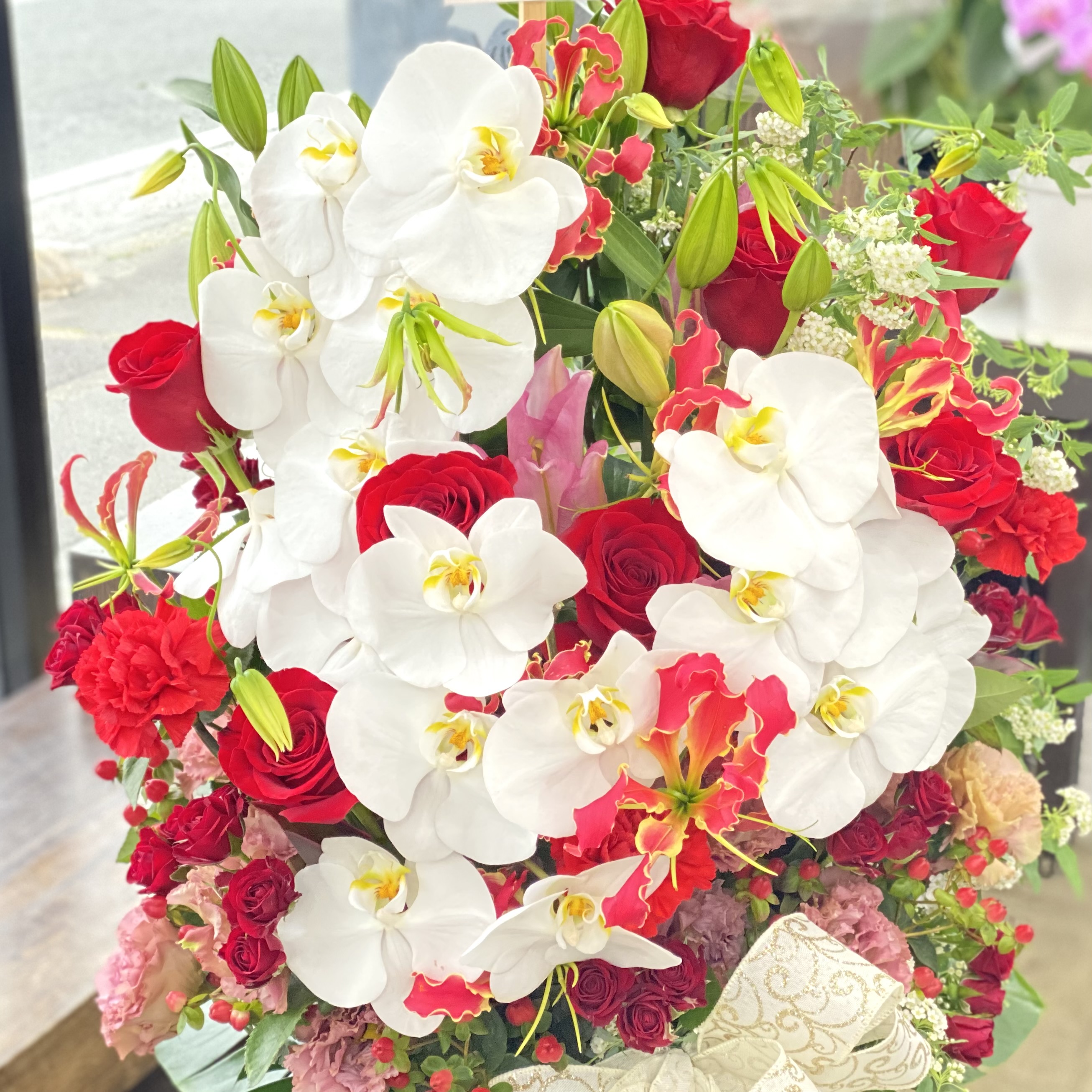 花材: メイン コチョウラン、ユリ、バラ、カーネーション、トルコギキョウ、グロリオサ、ヒペリカムなど その他 季節のお花、葉物類など